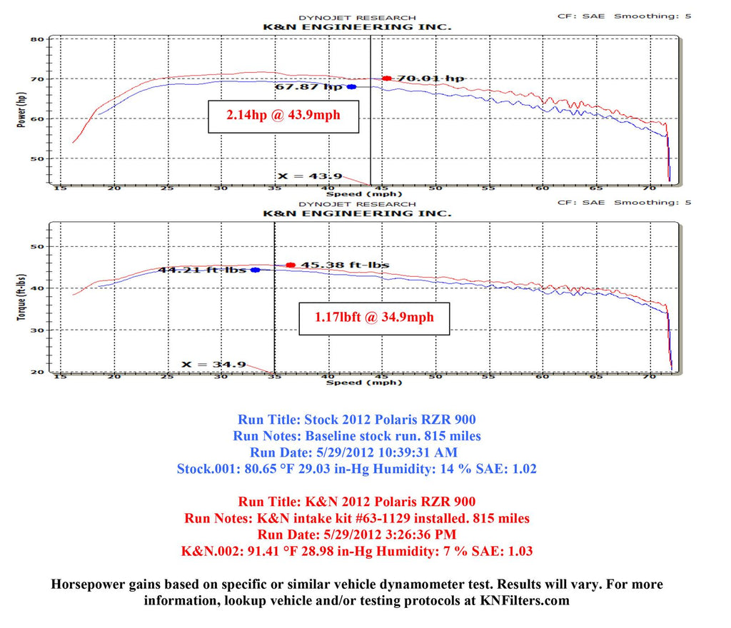 The K&N 57-1129 FIPK air intake system replaces the restrictive factory air filter and air intake housing in specific Polaris RZR 900 and Ranger RZR 900 models. K&N air intakes are designed to dramatically reduce intake restriction as they smooth and straighten air flow. This allows your engine to inhale a larger amount of air with less effort than the factory air filter assembly. More air means more usable power and acceleration throughout the engine’s RPM range. This air intake comes with dual chrome topped K&N high-flow air filters and a lidded heat shield that installs into the previous air box space. Air is directed through dual free-flowing aluminum intake tubes and into the engine’s throttle body for a guaranteed power gain. The oversized cylindrical shaped air filter is washable and reusable - ideal for the dusty/dirty environments that the Polaris RZR is typically driven in. This air intake is relatively easy to install usually in 90 minutes or less using existing factory mounting points. The tools needed are a couple of screwdrivers, a ratchet set and some wrenches.
