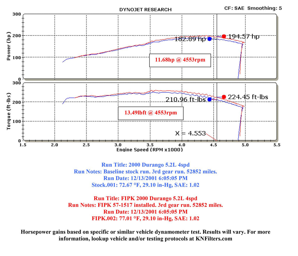 The K&N 57-1517-2 FIPK air intake system replaces the restrictive factory air filter and air intake housing in some Dodge Durango and Dakota models. K&N intakes are designed to dramatically reduce intake restriction as they smooth and straighten air flow. This allows your engine to inhale a larger amount of air than the factory air filter assembly. More air means more usable power and acceleration throughout the engine’s RPM range. The 57-1517-2 air intake comes with a chrome topped K&N high-flow air filter and a heat shield that installs into the previous air box space. Air is directed through an aerodynamically engineered intake tube into the engine’s throttle body for a guaranteed power gain. The air intake assembly accommodates the factory crank case vent hose, cruise control cable and vacuum line. The oversized cone shaped air filter can be used for up to 100,000 miles before servicing is needed depending on driving conditions. This air intake is relatively easy to install usually in 90 minutes or less using existing factory mounting points. The tools needed are a screwdriver, pliers, ratchet set and several wrenches. K&N 57 Series FIPK's are street legal in all 50 US states and come with K&N's Million Mile Limited Warranty.
