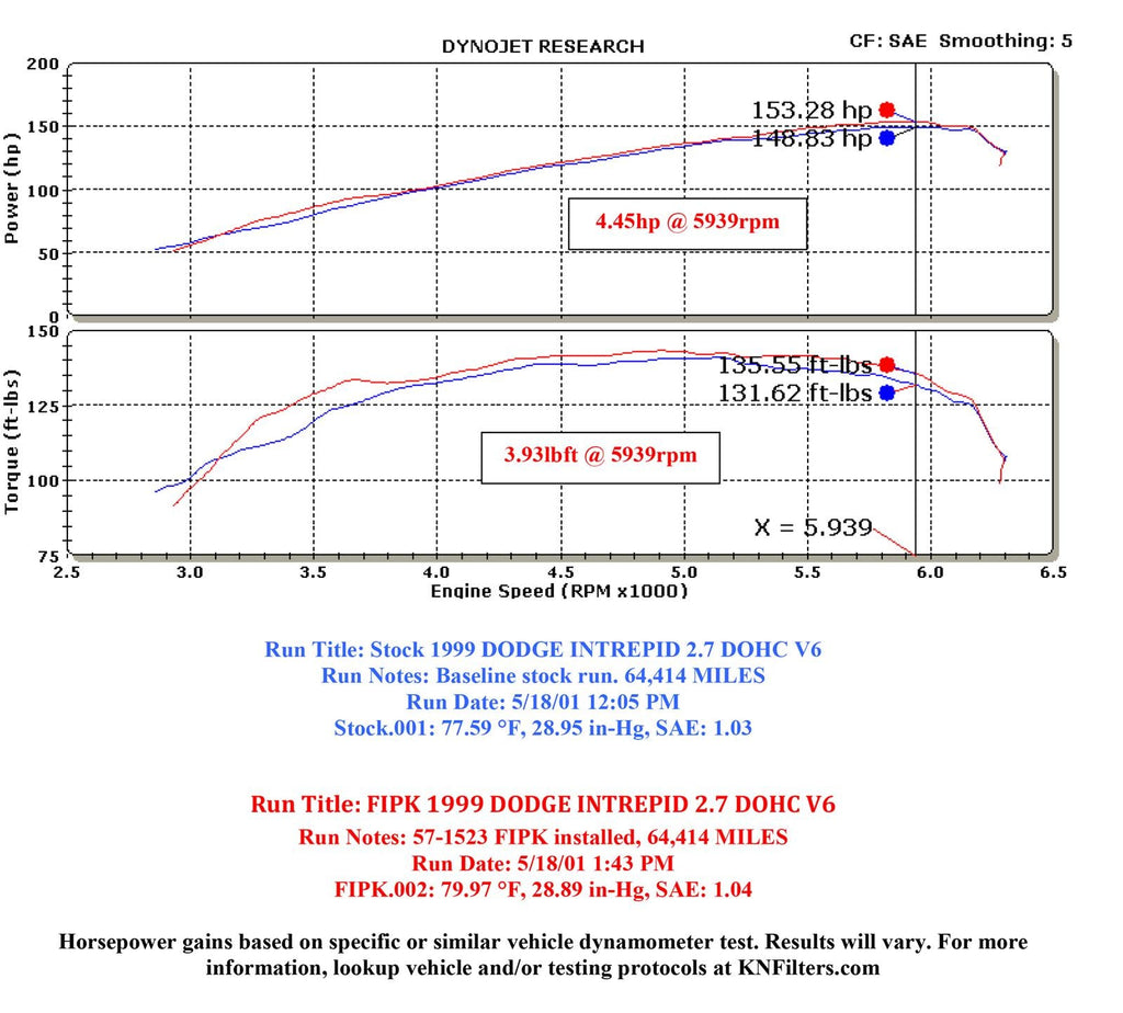 The K&N 57-1523 FIPK air intake system replaces the restrictive factory air filter and air intake housing in some Dodge Intreprid models. K&N intakes are designed to dramatically reduce intake restriction as they smooth and straighten air flow. This allows your engine to inhale a larger amount of air than the factory air filter assembly. More air means more usable power and acceleration throughout the engine’s RPM range. The 57-1523 air intake comes with a K&N XStream Top air filter designed for higher air flow and durability. A heat shield installs into the previous air box space that directs air through an intake tube into the engine’s throttle body for a guaranteed power gain. The oversized cone-shaped XStream Top air filter can be used for up to 100,000 miles before servicing is needed depending on driving conditions. This air intake is relatively easy to install usually in 90 minutes or less using existing factory mounting points and accommodates a factory vent hose. The tools needed are a screwdriver, ratchet set, side cutters and lubricant. K&N 57 Series FIPK's are street legal in all 50 US states and come with K&N's Million Mile Limited Warranty.
