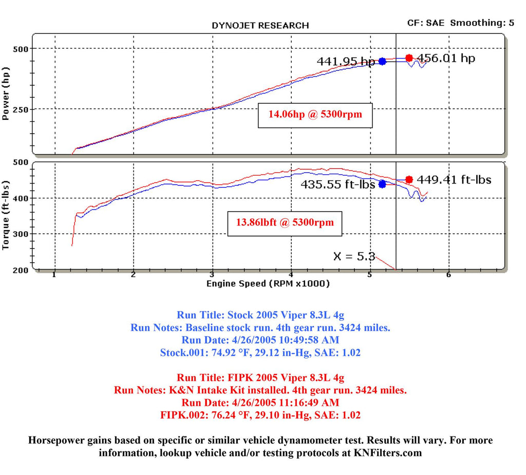 The K&N 57-1536 FIPK air intake system replaces the restrictive factory air filter and air intake housing in some Dodge Viper V10 models. K&N intakes are designed to dramatically reduce intake restriction as they smooth and straighten air flow. This allows your engine to inhale a larger amount of air than the factory air filter assembly. More air means more usable power and acceleration throughout the engine’s RPM range. The 57-1536 air intake comes with dual K&N XStream Top air filters designed for higher air flow and durability. Air is directed through the intake tubes into the engine’s throttle body for a guaranteed power gain. The tubes accommodate the factory air temperature sensor and crank case vent hose. The oversized cylinder shaped air filters can be used for up to 100,000 miles before servicing is needed depending on driving conditions. This air intake is relatively easy to install usually in 90 minutes or less using existing factory mounting points. The tools needed are a couple of screwdrivers and pliers. K&N 57 Series FIPK's are street legal in all 50 US states and come with K&N's Million Mile Limited Warranty.
