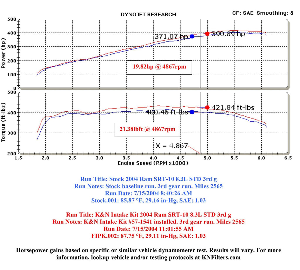 The K&N 57-1541 FIPK air intake system replaces the restrictive factory air filter and air intake housing in some Dodge Ram SRT-10 models. K&N intakes are designed to dramatically reduce intake restriction as they smooth and straighten air flow. This allows your Ram’s engine to inhale a larger amount of air than the factory air filter assembly. More air means more usable power and acceleration throughout the engine’s RPM range. The 57-1541 air intake comes with a chrome topped K&N high-flow air filter and a heat shield that installs into the previous air box space. Air is directed through an aerodynamically engineered intake tube into the engine’s throttle body for a guaranteed power gain. The air intake assembly accommodates the factory air temperature sensor, idle air hose and crank case vent hose. The oversized oval shaped air filter can be used for up to 100,000 miles before servicing is needed depending on driving conditions. This air intake is relatively easy to install usually in 90 minutes or less using existing factory mounting points. The tools needed are a screwdriver, a ratchet set and several wrenches. K&N 57 Series FIPK's are street legal in all 50 US states and come with K&N's Million Mile Limited Warranty.