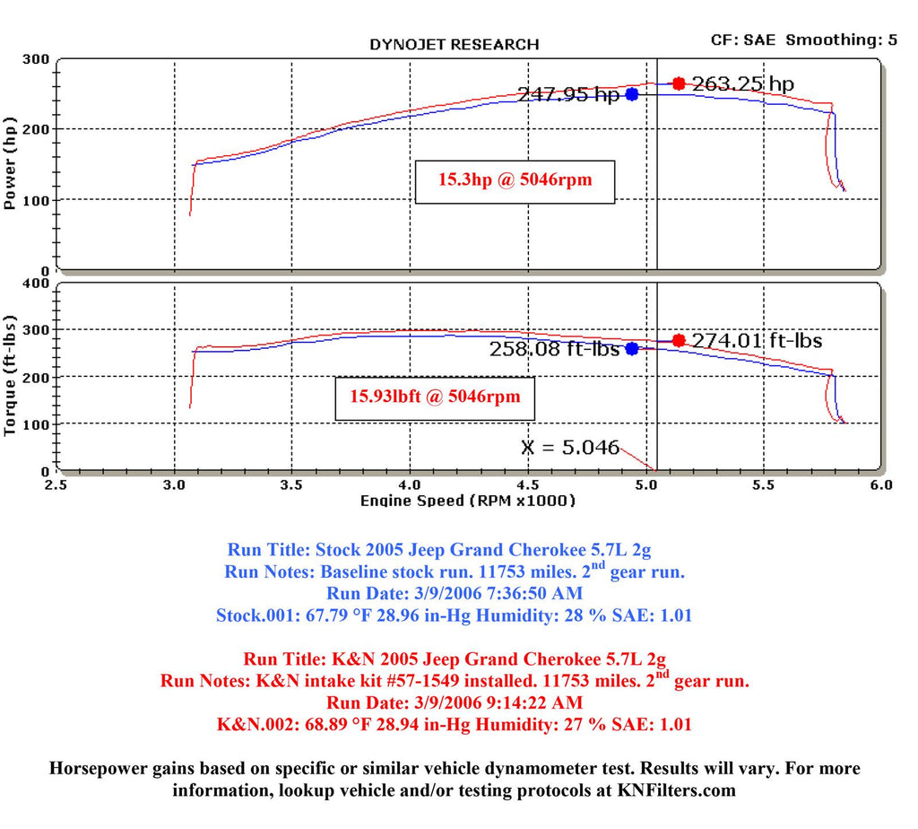 The K&N 57-1549 FIPK air intake system replaces the restrictive factory air filter and air intake housing in some Jeep models. K&N intakes are designed to dramatically reduce intake restriction as they smooth and straighten air flow. This allows your Jeep’s engine to inhale a larger amount of air than the factory air filter assembly. More air means more usable power and acceleration throughout the engine’s RPM range. The 57-1549 air intake comes with a chrome topped K&N high-flow air filter and a heat shield that installs into the previous air box space. Air is directed through an aerodynamically engineered intake tube into the engine’s throttle body for a guaranteed power gain. The tube accommodates the factory air temperature sensor and crank case vent hose. The oversized cone-shaped air filter can be used for up to 100,000 miles before servicing is needed depending on driving conditions. This air intake is relatively easy to install usually in 90 minutes or less using the existing factory mounting points. The tools needed are a screwdriver, socket set and several wrenches. K&N 57 Series FIPK's are street legal in all 50 US states and come with K&N's Million Mile Limited Warranty.