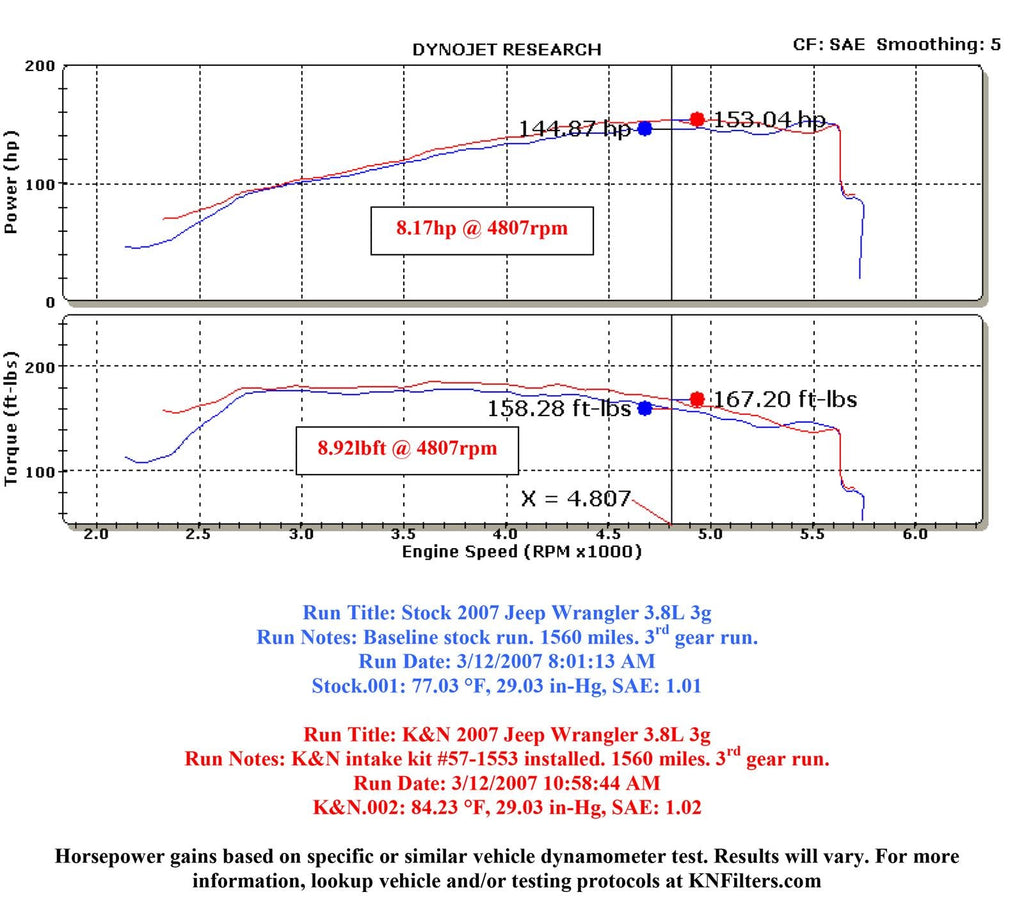 The K&N 57-1553 FIPK air intake system replaces the restrictive factory air filter and air intake housing in some Jeep Wrangler models. K&N intakes are designed to dramatically reduce intake restriction as they smooth and straighten air flow. This allows your Jeep’s engine to inhale a larger amount of air than the factory air filter assembly. More air means more usable power and acceleration throughout the engine’s RPM range. The 57-1553 air intake comes with a chrome topped K&N high-flow air filter and a heat shield that installs into the previous air box space. Air is directed through an aerodynamically engineered intake tube into the engine’s throttle body for a guaranteed power gain. The tube accommodates the factory air temperature sensor and crank case vent hose. The oversized cone shaped air filter can be used for up to 100,000 miles before servicing is needed depending on driving conditions. This air intake is relatively easy to install usually in 90 minutes or less using the existing factory mounting points. The tools needed are a screwdriver, a ratchet set and an Allen wrench. K&N 57 Series FIPK's are street legal in all 50 US states and come with K&N's Million Mile Limited Warranty.