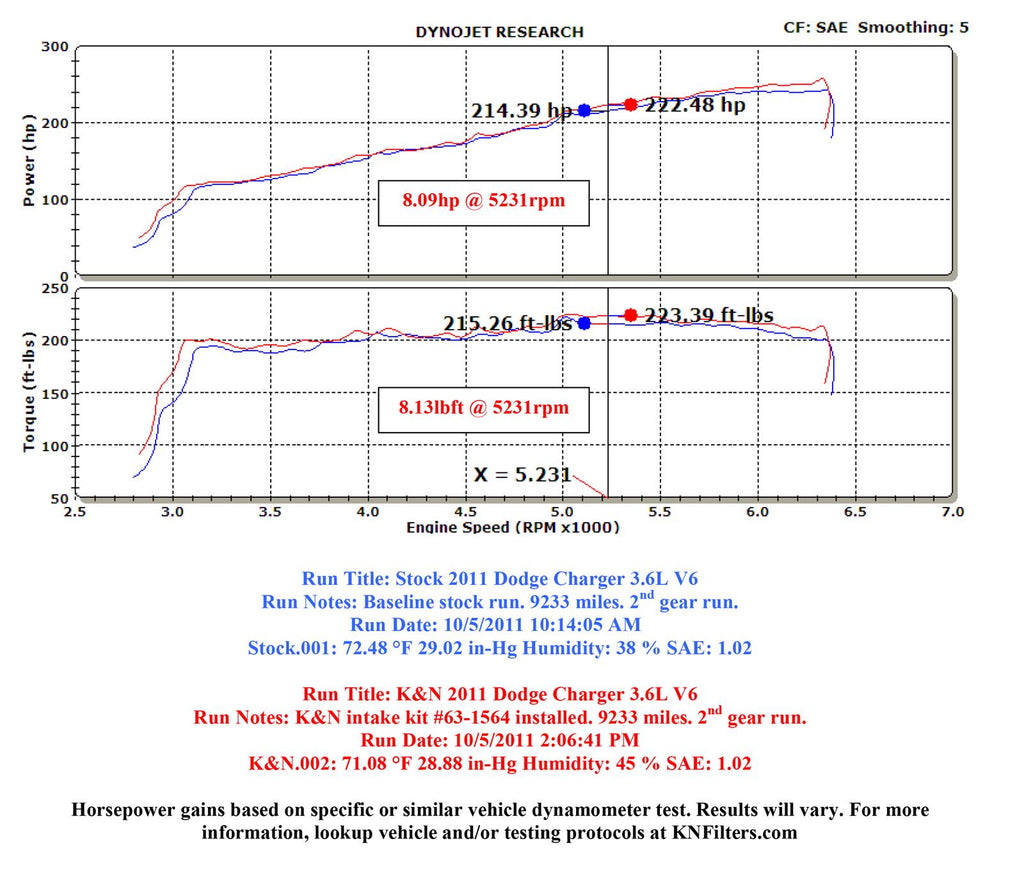The K&N 57-1564 FIPK air intake system replaces the restrictive factory air filter and air intake housing in specific Dodge Charger, Dodge Challenger and Chrysler 300 models. K&N intakes are designed to dramatically reduce intake restriction as they smooth and straighten air flow. This allows your vehicle’s engine to inhale a larger amount of air than the factory air filter assembly. More air means more usable power and acceleration throughout the engine’s RPM range. The 63-1564 air intake comes with a chrome topped K&N high-flow air filter and a heat shield that mounts onto the inner fender. This allows cooler, denser air to be directed through a custom molded intake tube into the engine’s throttle body for a guaranteed power gain. The oversized air filter can be used for up to 100,000 miles before servicing is needed depending on driving conditions. This air intake is relatively easy to install requiring only a screwdriver, socket set and several wrenches.