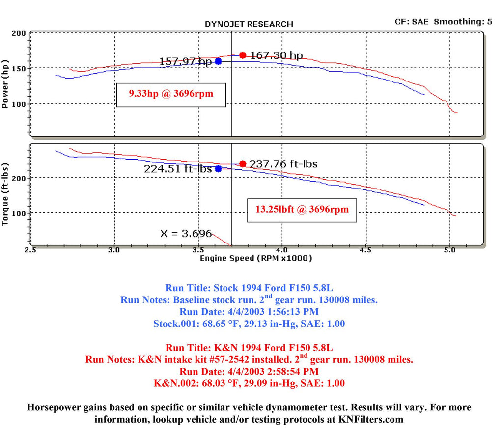 The K&N 57-2542 FIPK air intake system replaces your vehicle’s restrictive factory air filter and air intake housing. K&N intakes are designed to dramatically reduce intake restriction as they smooth and straighten air flow. This allows your engine to inhale a larger amount of air than the factory air filter assembly. More air means more usable power and acceleration throughout the engine’s RPM range. The 57-2542 air intake comes with a chrome topped K&N high-flow air filter and a heat shield that installs into the previous air box space. Air is directed through an aerodynamically engineered intake tube into the engine’s dual port throttle body for a guaranteed power gain. The tube accommodates the factory crank case vent hose. The oversized tapered cone-shaped air filter can be used for up to 100,000 miles before servicing is needed depending on driving conditions. This air intake is relatively easy to install usually in 90 minutes or less using the existing factory mounting points and requires commonly available tools. K&N 57 Series FIPK's are street legal in all 50 US states and come with K&N's Million Mile Limited Warranty.