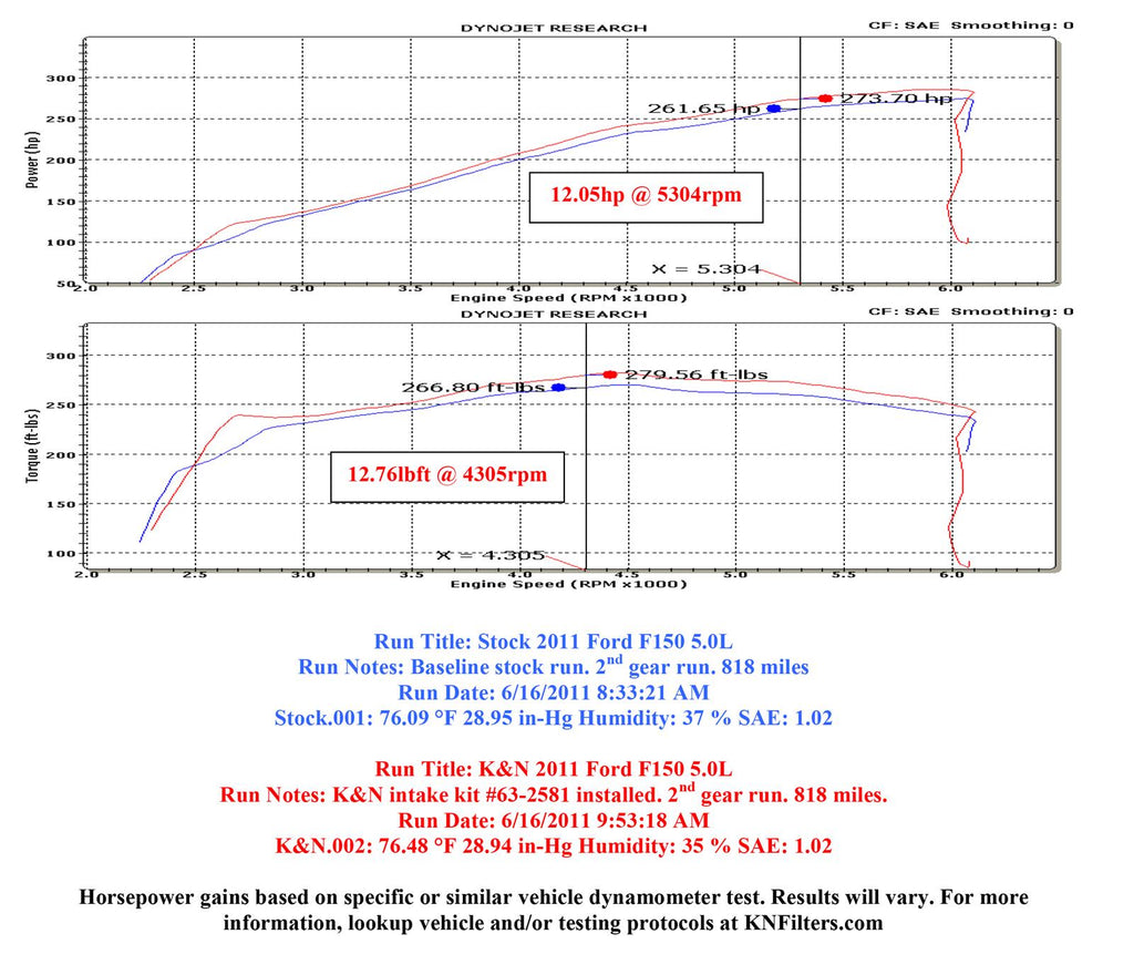 The K&N 57-2581 FIPK air intake system replaces the restrictive factory air filter and air intake housing in specific Ford F150 V8 models. K&N intakes are designed to dramatically reduce intake restriction as they smooth and straighten air flow. This allows your engine to inhale a larger amount of air than the factory air filter assembly. More air means more usable power and acceleration throughout the engine’s RPM range. This air intake comes with a chrome topped K&N high-flow air filter and a heat shield that installs into the lower air box space. Air is directed through an aerodynamically engineered intake tube into the engine’s throttle body for a guaranteed power gain. The tube accommodates the factory mass air sensor, crank case vent hose and EVAP hose. The oversized cone shaped air filter can be used for up to 100,000 miles before servicing is needed depending on driving conditions. This air intake is relatively easy to install usually in 90 minutes or less using existing factory mounting points. The tools needed are a screwdriver, ratchet set and several wrenches.