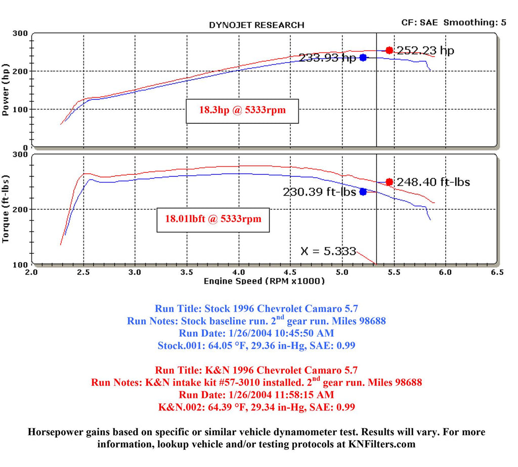 The K&N 57-3010-1 FIPK air intake system replaces your vehicle’s restrictive factory air filter and air intake housing. K&N intakes are designed to dramatically reduce intake restriction as they smooth and straighten air flow. This allows your engine to inhale a larger amount of air than the factory air filter assembly. More air means more usable power and acceleration throughout the engine’s RPM range. The 57-3010-1 air intake comes with a K&N high-flow air filter and directs air through an aerodynamically engineered intake tube into the engine’s throttle body for a guaranteed power gain. The oversized cone shaped air filter can be used for up to 100,000 miles before servicing is needed depending on driving conditions. This air intake installs in about 90 minutes or less requires commonly available tools. K&N 57 Series FIPK's are street legal in all 50 US states and come with K&N's Million Mile Limited Warranty.
