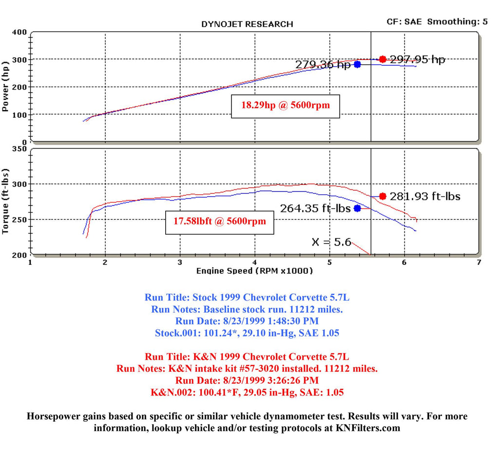 The K&N 57-3020 FIPK air intake system replaces the restrictive factory air filter and air intake housing in some Chevrolet Corvette models. K&N intakes are designed to dramatically reduce intake restriction as they smooth and straighten air flow. This allows your Corvette’s engine to inhale a larger amount of air than the factory air filter assembly. More air means more usable power and acceleration throughout the engine’s RPM range. The 57-3020 air intake comes with a carbon fiber topped K&N high-flow air filter that directs air past the mass air sensor and through an aerodynamically engineered intake tube into the engine’s throttle body for a guaranteed power gain. The tube accommodates the factory air temperature sensor, mass air sensor, fuel pressure regulator vacuum line and a replacement silicone air injection hose. The oversized air filter can be used for up to 100,000 miles before servicing is needed depending on driving conditions. This air intake typically installs in 90 minutes or less and requires commonly available tools. K&N 57 Series FIPK's are street legal in all 50 US states and come with K&N's Million Mile Limited Warranty.