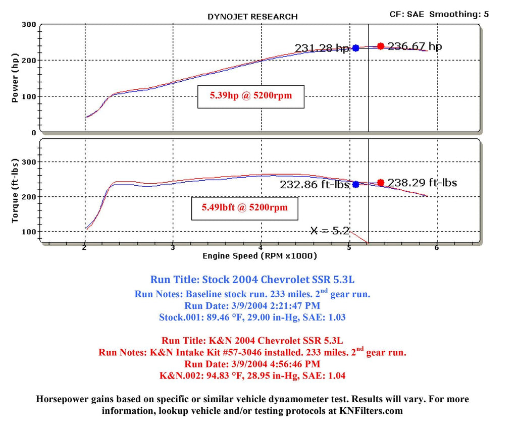 The K&N 57-3046 FIPK air intake system replaces the restrictive factory air filter and air intake housing in some Chevrolet SSR V8 models. K&N intakes are designed to dramatically reduce intake restriction as they smooth and straighten air flow. This allows your engine to inhale a larger amount of air than the factory air filter assembly. More air means more usable power and acceleration throughout the engine’s RPM range. The 57-3046 air intake comes with an ultra-light carbon fiber topped and flanged K&N high-flow air filter and a heat shield that installs into the previous air box space. Air is directed through an aerodynamically engineered intake tube into the engine’s throttle body for a guaranteed power gain. The oversized oval shaped air filter can be used for up to 100,000 miles before servicing is needed depending on driving conditions. This air intake is relatively easy to install usually in 90 minutes or less using existing factory mounting points and accommodates the factory mass air sensor. The tools needed are a screwdriver, a ratchet set and an Allen wrench. K&N 57 Series FIPK's are street legal in all 50 US states and come with K&N's Million Mile Limited Warranty.