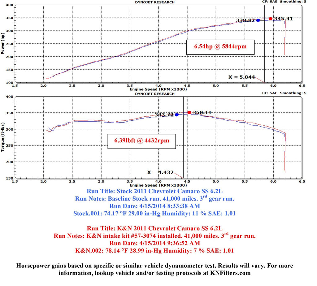 The K&N 57-3074 FIPK air intake system replaces the restrictive factory air filter and air intake tubing while retaining the factory air box on specific Chevrolet Camaro SS models. K&N air intakes are designed to dramatically reduce intake restriction as they smooth and straighten air flow for a guaranteed horsepower gain. This allows your engine to inhale a larger amount of air than the factory air filter and air intake assembly. More air means more usable power and acceleration throughout the engine’s RPM range. This air intake comes with a replacement K&N high-flow air filter and an aerodynamically engineered intake tube that easily connects to your vehicle’s factory air box and throttle body. The air filter can be used for up to 50,000 miles before servicing is needed depending on driving conditions. This air intake system is designed for quick and easy installation with commonly available tools.