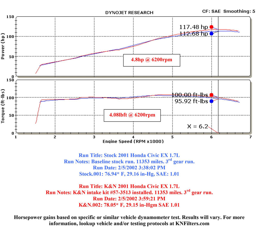 The K&N 57-3513 FIPK air intake system replaces the restrictive factory air filter and air intake housing in some Honda Civic models. K&N intakes are designed to dramatically reduce intake restriction as they smooth and straighten air flow. This allows your Civic’s engine to inhale a larger amount of air than the factory air filter assembly. More air means more usable power and acceleration throughout the engine’s RPM range. The 57-3513 air intake comes with a carbon fiber topped K&N high-flow air filter and a heat shield that installs into the previous air box space. Air is directed through an aerodynamically engineered intake tube into the engine’s throttle body for a guaranteed power gain. The tube accommodates the air temperature sensor and crank case vent hose. The oversized cone shaped air filter can be used for up to 100,000 miles before servicing is needed depending on driving conditions. This air intake is relatively easy to install usually in 90 minutes or less using the existing factory mounting points. The tools needed a screwdriver, socket set and a 10 millimeter wrench. K&N 57 Series FIPK's are street legal in all 50 US states and come with K&N's Million Mile Limited Warranty.