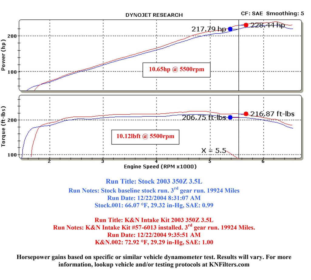 The K&N 57-6013 FIPK air intake system replaces the restrictive factory air filter and air intake housing in some Nissan 350Z models. K&N intakes are designed to dramatically reduce intake restriction as they smooth and straighten air flow. This allows your 350Z’s engine to inhale a larger amount of air than the factory air filter assembly. More air means more usable power and acceleration throughout the engine’s RPM range. The 57-6013 air intake comes with a chrome topped K&N high-flow air filter and a heat shield that installs into the previous air box space. Air is directed through an aerodynamically engineered intake tube into the engine’s throttle body for a guaranteed power gain. The tube accommodates the factory mass air sensor. The oversized cone shaped air filter can be used for up to 100,000 miles before servicing is needed depending on driving conditions. This air intake is relatively easy to install usually in 90 minutes or less using the existing factory mounting points. The tools needed are a couple of screwdrivers, a ratchet set and an Allen wrench. K&N 57 Series FIPK's are street legal in all 50 US states and come with K&N's Million Mile Limited Warranty.