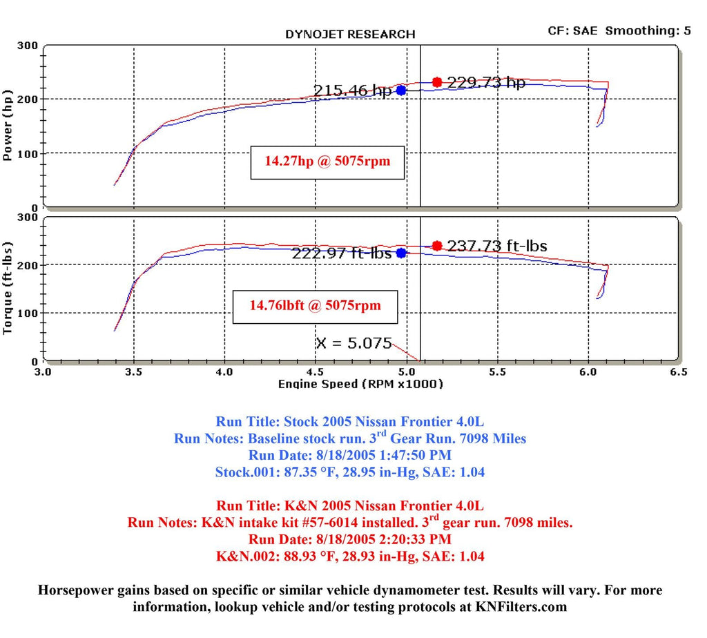 The K&N 57-6014 FIPK air intake system replaces your vehicle’s restrictive factory air filter and air intake housing. K&N intakes are designed to dramatically reduce intake restriction as they smooth and straighten air flow. This allows your engine to inhale a larger amount of air than the factory air filter assembly. More air means more usable power and acceleration throughout the engine’s RPM range. The 57-6014 air intake comes with a chrome topped K&N high-flow air filter and a heat shield that installs into the previous air box space. Air is directed through an aerodynamically engineered intake tube into the engine’s throttle body for a guaranteed power gain. The tube accommodates the mass air sensor and crank case vent hose. The oversized cone-shaped air filter can be used for up to 100,000 miles before servicing is needed depending on driving conditions. This air intake is relatively easy to install usually in 90 minutes or less using the existing factory mounting points. The tools needed are a couple of screwdrivers, pliers, a socket set and several wrenches. K&N 57 Series FIPK's are street legal in all 50 US states and come with K&N's Million Mile Limited Warranty.