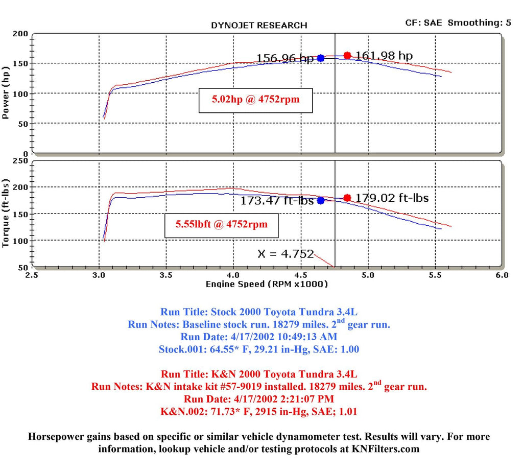 The K&N 57-9019 FIPK air intake system replaces the restrictive factory air filter and air intake housing in some Toyota Tundra 3.4L V6 models. K&N intakes are designed to dramatically reduce intake restriction as they smooth and straighten air flow. This allows your engine to inhale a larger amount of air than the factory air filter assembly. More air means more usable power and acceleration throughout the engine’s RPM range. The 57-9019 air intake comes with a chrome topped K&N high-flow air filter and a heat shield that installs into the previous air box space. Air is directed through an aerodynamically engineered intake tube into the engine’s throttle body for a guaranteed power gain. The tube accommodates the factory mass air sensor and crank case vent hose. The oversized cone shaped air filter can be used for up to 100,000 miles before servicing is needed depending on driving conditions. This air intake is relatively easy to install usually in 90 minutes or less using existing factory mounting points. The tools needed are a screwdriver, side cutters, ratchet set and several wrenches. K&N 57 Series FIPK's are street legal in all 50 US states and come with K&N's Million Mile Limited Warranty.