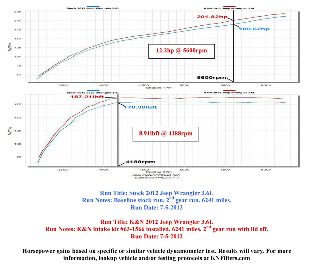 The K&N AirCharger 63-1566 air intake system replaces the restrictive factory air filter and air intake housing in some Jeep Wrangler models. K&N intakes are designed to dramatically reduce intake restriction as they smooth and straighten air flow. This allows your Wrangler’s engine to inhale a larger amount of air than the factory air filter assembly. More air means more usable power and acceleration throughout the engine’s RPM range. The 63-1566 air intake comes with a chrome topped K&N high-flow air filter and a K&N embossed heat shield that mounts into the lower air box to act as a cover allowing cooler, denser air to be directed through a custom molded intake tube into the engine’s throttle body for a guaranteed power gain. The oversized air filter can be used for up to 100,000 miles before servicing is needed depending on driving conditions. This air intake is relatively easy to install requiring only a screwdriver, a socket set and several wrenches. This air intake cannot be sold in California. It is not legal for use in California or other states adopting California emission standards.