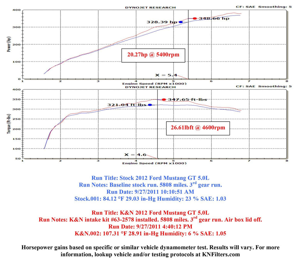 The K&N AirCharger 63-2500 air intake system replaces the restrictive factory air filter and air intake housing in some Ford Mustang GT models. K&N intakes are designed to dramatically reduce intake restriction as they smooth and straighten air flow. This allows your Mustang’s engine to inhale a larger amount of air than the factory air filter assembly. More air means more usable power and acceleration throughout the engine’s RPM range. The 63-2500 air intake comes with a K&N high-flow air filter and a light-weight carbon fiber heat shield lid that directs cooler air into the custom molded intake for a guaranteed power gain. The oversized air filter can be used for up to 100,000 miles before servicing is needed depending on driving conditions. This air intake is relatively easy to install using commonly available tools. This air intake cannot be sold in California. It is not legal for use in California or other states adopting California emission standards.