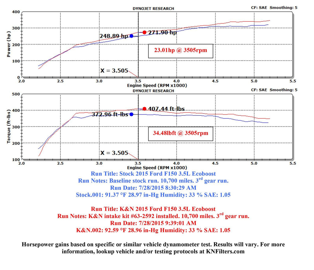 The K&N 63-2592 AirCharger air intake system replaces the restrictive factory air filter and air intake housing on specific Ford F150 EcoBoost models. K&N air intakes are designed to dramatically reduce air intake restriction as well as smooth and straighten air flow. This allows your engine to inhale a larger amount of air than the factory air filter assembly. More air means more usable power and acceleration throughout the engine’s RPM range. The air intake comes with a chrome topped K&N high-flow air filter and a heat shield that installs into the original air box space. Air is directed through an aerodynamically engineered intake tube into the engine’s throttle body and turbo inlet for a guaranteed power gain. The tube accommodates the factory air temperature sensor. The oversized cone shaped air filter can be used for up to 100,000 miles before servicing is needed depending on driving conditions. This air intake is relatively easy to install, usually in 90 minutes or less using your vehicle’s existing factory mounting points. The tools needed are a screwdriver and an Allen wrench. This air intake cannot be sold in California. It is not legal for use in California or other states adopting California emission standards.