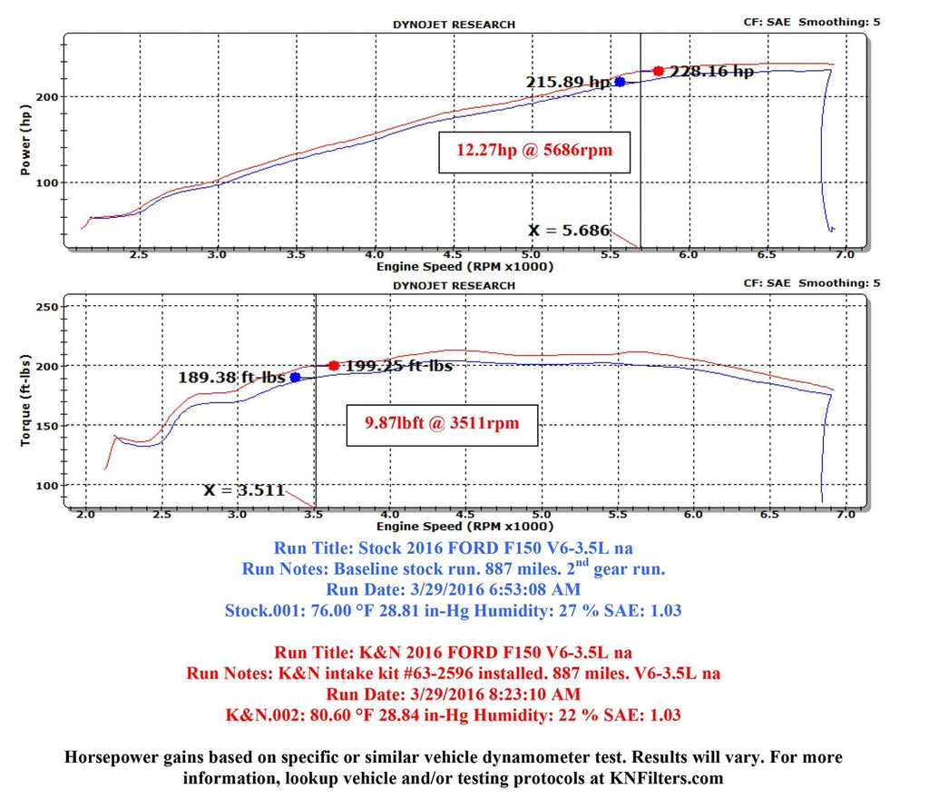 The K&N 63-2596 AirCharger air intake system replaces the restrictive factory air filter and air intake housing on specific Ford F150 models. K&N air intakes are designed to dramatically reduce air intake restriction as well as smooth and straighten air flow. This allows your engine to inhale a larger amount of air than the factory air filter assembly. More air means more usable power and acceleration throughout the engine’s RPM range. The air intake comes with a chrome topped K&N high-flow air filter and a heat shield that installs into the original air box space. Air is directed through an aerodynamically engineered intake tube into the engine’s throttle body for a guaranteed power gain. The tube accommodates the factory EVAP and crank case vent hoses. The oversized cone shaped air filter can be used for up to 100,000 miles before servicing is needed depending on driving conditions. This air intake is relatively easy to install, usually in 90 minutes or less using your vehicle’s existing factory mounting points. The tools needed are a screwdriver and several wrenches.