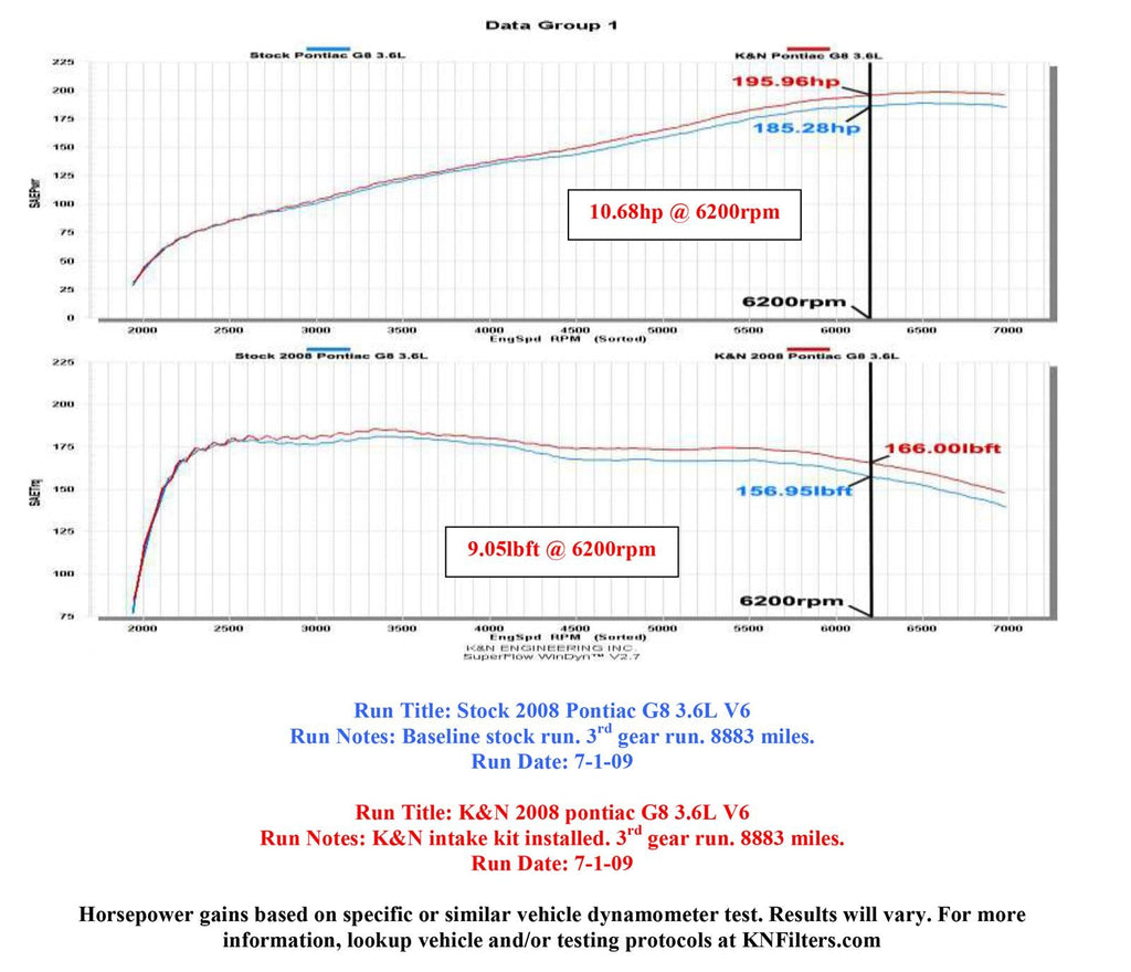 The K&N AirCharger 63-3072 air intake system replaces the restrictive factory air filter and air intake housing in some Pontiac G8 models. K&N intakes are designed to dramatically reduce intake restriction as they smooth and straighten air flow. This allows your G8’s engine to inhale a larger amount of air than the factory air filter assembly. More air means more usable power and acceleration throughout the engine’s RPM range. The 63-3072 air intake comes with a chrome topped K&N high-flow air filter and a heat shield that installs into the previous air box space. The placement allows air to be directed through a custom molded intake tube into the engine’s throttle body for a guaranteed power gain. The oversized air filter can be used for up to 100,000 miles before servicing is needed depending on driving conditions. This air intake is relatively easy to install requiring only a screwdriver, socket set and several wrenches. This air intake cannot be sold in California. It is not legal for use in California or other states adopting California emission standards.