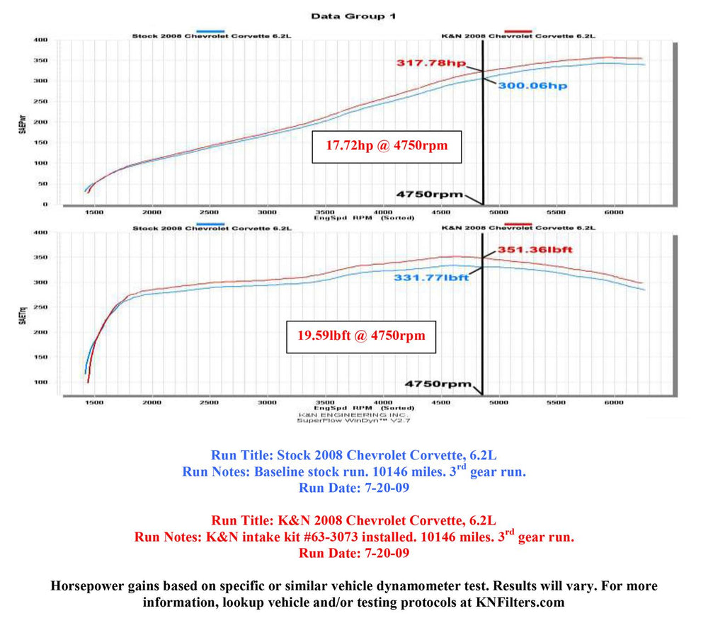 The K&N AirCharger 63-3073 air intake system replaces the restrictive factory air filter and air intake housing in some Chevrolet Corvette models. K&N intakes are designed to dramatically reduce intake restriction as they smooth and straighten air flow. This allows your Corvette’s engine to inhale a larger amount of air than the factory air filter assembly. More air means more usable power and acceleration throughout the engine’s RPM range. The 63-3073 air intake comes with a K&N carbon fiber top and flanged high-flow air filter that directs air into the custom molded intake for a guaranteed power gain. The oversized air filter can be used for up to 100,000 miles before servicing is needed depending on driving conditions. This air intake is relatively easy to install requiring only a screwdriver and several wrenches. This air intake cannot be sold in California. It is not legal for use in California or other states adopting California emission standards.