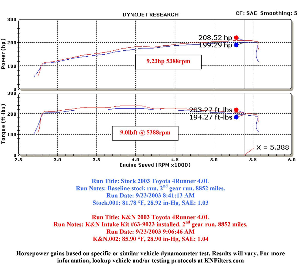 The K&N AirCharger 63-9023 air intake system replaces the restrictive factory air filter and air intake housing in some Toyota 4Runner models. K&N intakes are designed to dramatically reduce intake restriction as they smooth and straighten air flow. This allows your 4Runner’s engine to inhale a larger amount of air than the factory air filter assembly. More air means more usable power and acceleration throughout the engine’s RPM range. The 63-9023 air intake comes with a chrome topped K&N high-flow air filter and a heat shield that mounts onto the inner fender. This allows cooler, denser air to be directed through a custom molded intake tube into the engine’s throttle body for a guaranteed power gain. The oversized air filter can be used for up to 100,000 miles before servicing is needed depending on driving conditions. This air intake is relatively easy to install requiring only pliers, a socket set, a couple of screwdrivers and several wrenches. This air intake cannot be sold in California. It is not legal for use in California or other states adopting California emission standards.