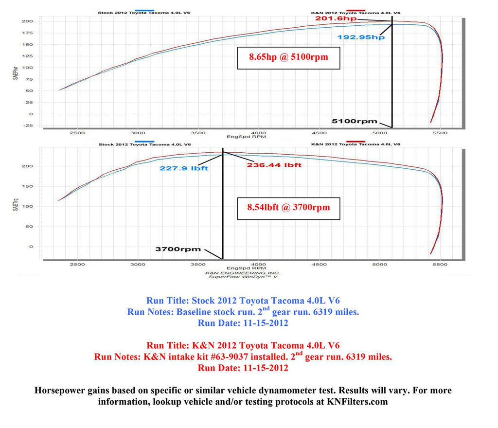 The K&N AirCharger 63-9037 air intake system replaces the restrictive factory air filter and air intake housing in some Toyota Tacoma models. K&N intakes are designed to dramatically reduce intake restriction as they smooth and straighten air flow. This allows your Tacoma’s engine to inhale a larger amount of air than the factory air filter assembly. More air means more usable power and acceleration throughout the engine’s RPM range. The 63-9037 air intake comes with a chrome topped K&N high-flow air filter and a heat shield that mounts onto the inner fender. This allows cooler, denser air to be directed through a custom molded intake tube into the engine’s throttle body for a guaranteed power gain. The oversized air filter can be used for up to 100,000 miles before servicing is needed depending on driving conditions. This air intake is relatively easy to install using commonly available tools. This air intake cannot be sold in California. It is not legal for use in California or other states adopting California emission standards.