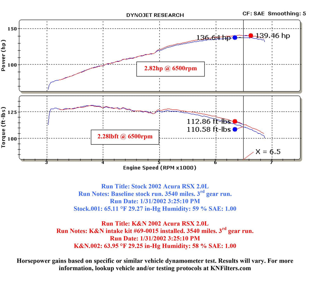 The K&N 69-0015TR Typhoon air intake system is a free-flowing, mandrel-bent aluminum tube air induction system designed to fit some Acura RSX and Honda CR-V models. The restrictive factory air filter and air intake housing are replaced by the K&N Typhoon air intake which is designed to dramatically reduce air flow restriction as it smoothes and straightens air flow. This allows your engine to inhale a larger amount of air than the factory air intake. More air means more usable power and acceleration throughout the engine’s RPM range. The 69-0015TR air intake comes with a black rubber topped K&N high-flow air filter that installs into the previous air box space. Air is directed through the intake tube into the engine’s throttle body for a guaranteed power gain. The intake tube has an attractive red powder-coat finish that's made to last and it accommodates the factory IA bypass control thermal valve, air temperature sensor and crank case vent hose. The oversized cone shaped air filter can be used for up to 100,000 miles before servicing is needed depending on driving conditions. This air intake is relatively easy to install usually in 90 minutes or less. Some Typhoon air intakes are not legal for sale or use in California and other states adopting California emission standards while others are CARB exempt and 50 state legal. Check the vehicle applications and specific CARB status for each vehicle and air intake.