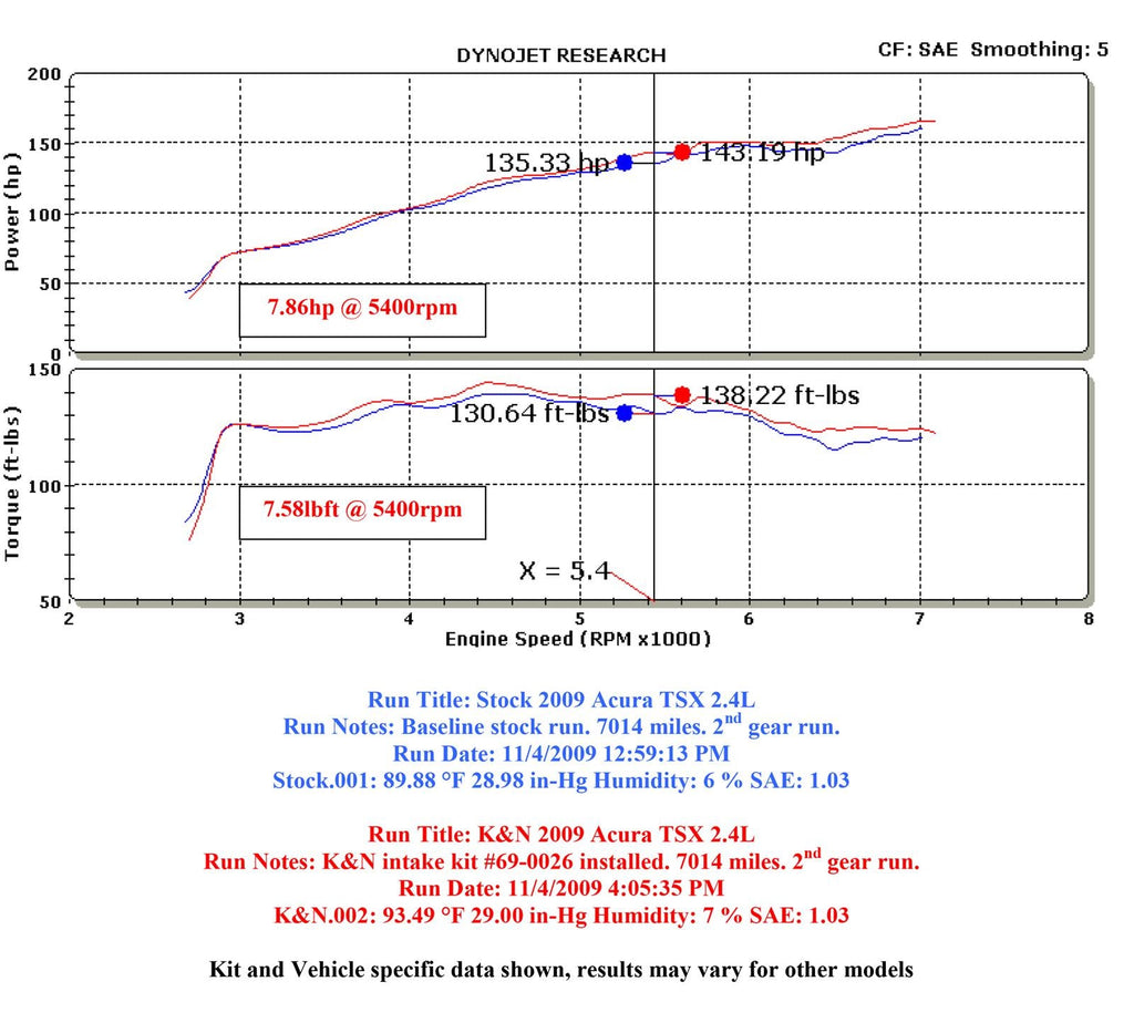 The K&N 69-0026TS Typhoon air intake system is a free-flowing, mandrel-bent aluminum tube air induction system designed to fit some Acura TSX models. The restrictive factory air filter and air intake housing are replaced by the K&N Typhoon air intake which is designed to dramatically reduce air flow restriction as it smoothes and straightens air flow. This allows your engine to inhale a larger amount of air than the factory air intake. More air means more usable power and acceleration throughout the engine’s RPM range. The 69-0026TS air intake comes with a chrome topped K&N high-flow air filter and a heat shield that installs into the previous air box space. Air is directed through the intake tube into the engine’s throttle body for a guaranteed power gain. The intake tube has an attractive silver powder-coat finish that's made to last and it accommodates the factory mass air sensor and a replacement silicone crank case vent hose. The oversized cone shaped air filter can be used for up to 100,000 miles before servicing is needed depending on driving conditions. This air intake is relatively easy to install usually in 90 minutes or less using existing factory mounting points. The tools needed are a couple of screwdriver, ratchet set and a 10 millimeter wrench. Some Typhoon air intakes are not legal for sale or use in California and other states adopting California emission standards while others are CARB exempt and 50 state legal. Check the K&N catalog or website for vehicle applications and specific CARB status for each vehicle and air intake.