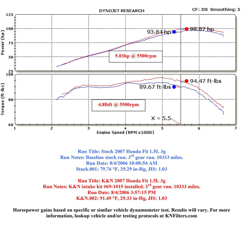 The K&N 69-1016-1TS Typhoon air intake system is a free-flowing, mandrel-bent aluminum tube air induction system designed to fit some Honda Fit models. The restrictive factory air filter and air intake housing are replaced by the K&N Typhoon air intake which is designed to dramatically reduce air flow restriction as it smoothes and straightens air flow. This allows your engine to inhale a larger amount of air than the factory air intake. More air means more usable power and acceleration throughout the engine’s RPM range. The 69-1016-1TS air intake comes with a black rubber topped K&N high-flow air filter and a heat shield that installs into the previous air box space. Air is directed through the intake tube into the engine’s throttle body for a guaranteed power gain. The intake tube has an attractive silver powder-coat finish that's made to last and it accommodates the factory air temperature sensor and crank case vent hose. The oversized cone shaped air filter can be used for up to 100,000 miles before servicing is needed depending on driving conditions. This air intake is relatively easy to install usually in 90 minutes or less using existing factory mounting points. The tools needed are a couple of screwdrivers, pliers and a ratchet set. Some Typhoon air intakes are not legal for sale or use in California and other states adopting California emission standards while others are CARB exempt and 50 state legal. Check the K&N catalog or website for vehicle applications and specific CARB status for each vehicle and air intake.