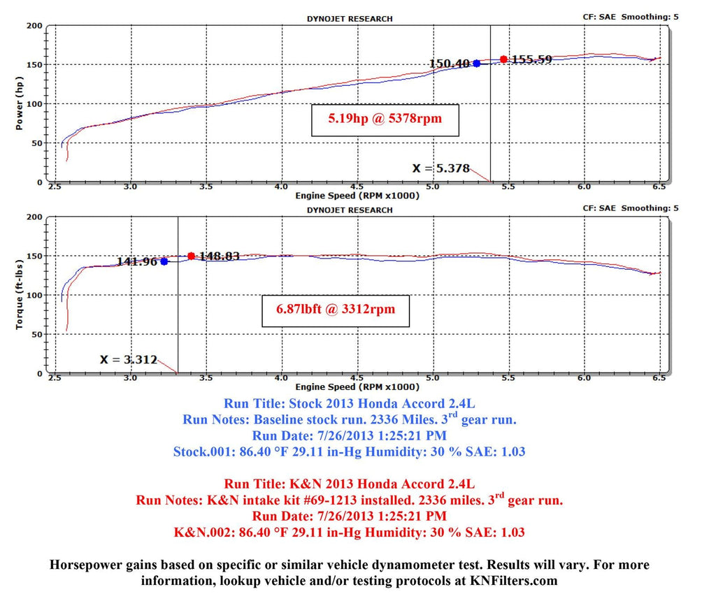 The K&N 69-1213TS Typhoon air intake system is a free-flowing, mandrel-bent aluminum tube air induction system designed to fit some Honda Accord models. The restrictive factory air filter and air intake housing are replaced by the K&N Typhoon air intake which is designed to dramatically reduce air flow restriction as it smoothes and straightens air flow. This allows your engine to inhale a larger amount of air than the factory air intake. More air means more usable power and acceleration throughout the engine’s RPM range. The 69-1213TS air intake comes with a black rubber topped K&N high-flow air filter and a heat shield that installs into the previous air box space. Air is directed through the intake tube into the engine’s throttle body for a guaranteed power gain. The intake tube has an attractive silver powder-coat finish that's made to last and it accommodates the factory mass air sensor and crank case vent hose. The oversized cone shaped air filter can be used for up to 100,000 miles before servicing is needed depending on driving conditions. This air intake is relatively easy to install usually in 90 minutes or less. Some Typhoon air intakes are not legal for sale or use in California and other states adopting California emission standards while others are CARB exempt and 50 state legal. Check the vehicle applications and specific CARB status for each vehicle and air intake.