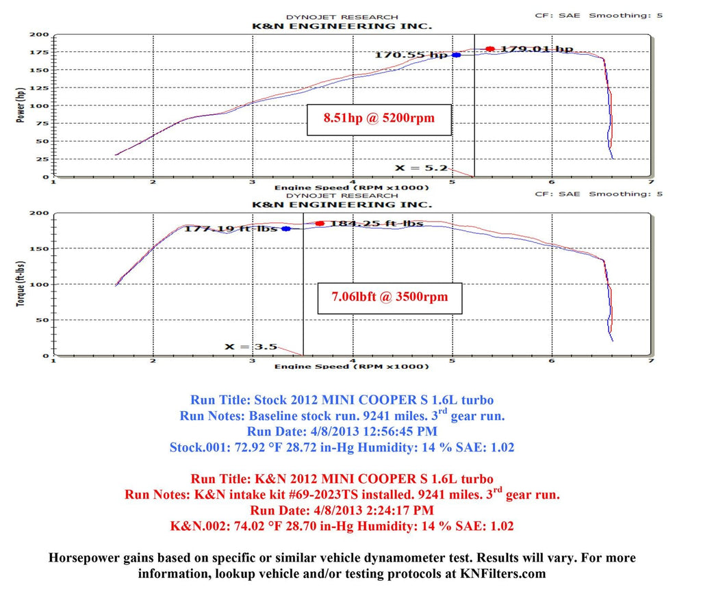 The K&N 69-2023TS Typhoon air intake system is a free-flowing, mandrel-bent aluminum tube air induction system designed to fit some Mini Cooper S models. The restrictive factory air filter and air intake housing are replaced by the K&N Typhoon air intake which is designed to dramatically reduce air flow restriction as it smoothes and straightens air flow. This allows your engine to inhale a larger amount of air than the factory air intake. More air means more usable power and acceleration throughout the engine’s RPM range. The 69-2023TS air intake comes with a black rubber topped K&N high-flow air filter and a rectangular heat shield that installs into the previous air box space. Air is directed through the intake tube into the engine’s throttle body for a guaranteed power gain. The intake tube has an attractive silver powder-coat finish that's made to last and it accommodates the factory mass air sensor. The oversized tapered cone-shaped air filter can be used for up to 100,000 miles before servicing is needed depending on driving conditions. This air intake is relatively easy to install usually in 90 minutes or less using existing factory mounting points. Some Typhoon air intakes are not legal for sale or use in California and other states adopting California emission standards while others are CARB exempt and 50 state legal. Check the vehicle applications and specific CARB status for each vehicle and air intake.