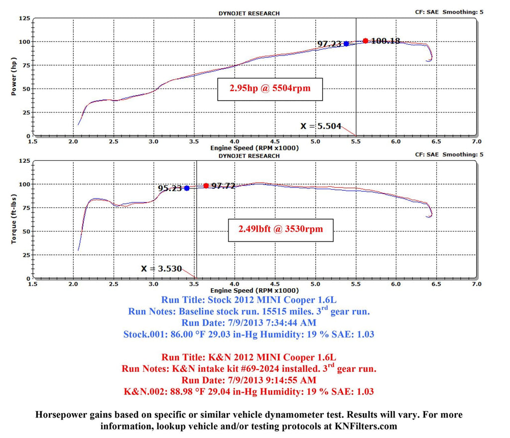 The K&N 69-2024TTK Typhoon air intake system is a free-flowing, mandrel-bent aluminum tube air induction system designed to fit some Mini Cooper models. The restrictive factory air filter and air intake housing are replaced by the K&N Typhoon air intake which is designed to dramatically reduce air flow restriction as it smoothes and straightens air flow. This allows your engine to inhale a larger amount of air than the factory air intake. More air means more usable power and acceleration throughout the engine’s RPM range. The 69-2024TTK air intake comes with a chrome topped K&N high-flow air filter and a stylish K&N branded heat shield that installs into the previous air box space. Air is directed through the intake tube into the engine’s throttle body for a guaranteed power gain. The intake tube has an attractive black powder-coat finish that's made to last and it accommodates the factory mass air sensor. The elongated cylinder shaped air filter can be used for up to 100,000 miles before servicing is needed depending on driving conditions. This air intake is relatively easy to install usually in 90 minutes or less. Some Typhoon air intakes are not legal for sale or use in California and other states adopting California emission standards while others are CARB exempt and 50 state legal. Check the vehicle applications and specific CARB status for each vehicle and air intake.
