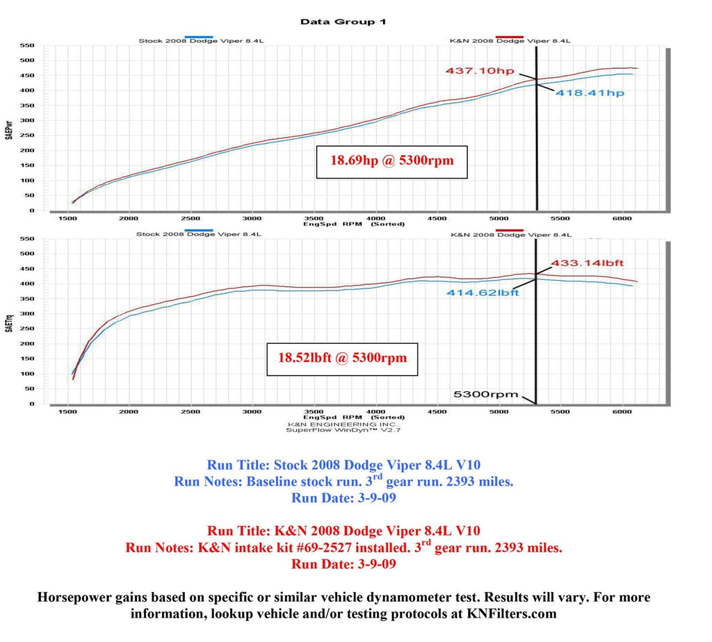 The K&N 69-2527TTR Typhoon air intake system is a free-flowing, mandrel-bent aluminum tube air induction system designed to fit some Dodge Viper models. The restrictive factory air filter and air intake housing are replaced by the K&N Typhoon air intake which is designed to dramatically reduce air flow restriction as it smoothes and straightens air flow. This allows your engine to inhale a larger amount of air than the factory air intake. More air means more usable power and acceleration throughout the engine’s RPM range. The 69-2527TTR air intake comes with a pair of chrome topped K&N high-flow air filter and a heat shield that installs into the previous air box space. Air is directed through the intake tubes into the engine’s throttle bodies for a guaranteed power gain. The intake tubes have an attractive red powder-coat finish that's made to last and it accommodates the factory mass air sensors and crank case vent hoses. The oversized cone shaped air filters come with water repellent DryCharger filter wraps to protect the filters from moisture. The air filters can be used for up to 100,000 miles before servicing is needed depending on driving conditions. This air intake is relatively easy to install usually in 90 minutes or less using existing factory mounting points. The tools needed are a couple of screwdrivers, pliers, a ratchet set and some wrenches. Some Typhoon air intakes are not legal for sale or use in California and other states adopting California emission standards while others are CARB exempt and 50 state legal. Check the K&N catalog or website for vehicle applications and specific CARB status for each vehicle and air intake.