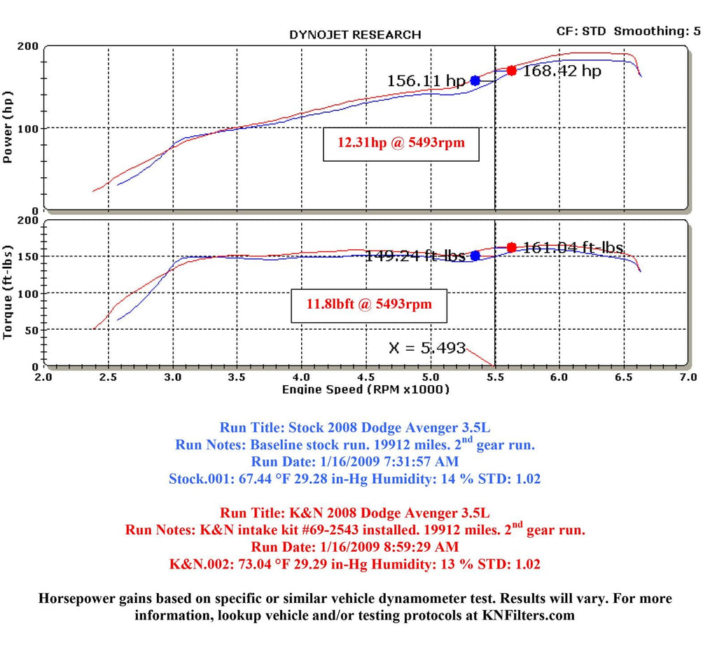 The K&N 69-2543TTK Typhoon air intake system is a free-flowing, mandrel-bent aluminum tube air induction system designed to fit some Dodge Avenger models. The restrictive factory air filter and air intake housing are replaced by the K&N Typhoon air intake which is designed to dramatically reduce air flow restriction as it smoothes and straightens air flow. This allows your engine to inhale a larger amount of air than the factory air intake. More air means more usable power and acceleration throughout the engine’s RPM range. The 69-2543TTK air intake comes with a black rubber topped K&N high-flow air filter and a heat shield that installs into the previous air box space. Air is directed through the intake tube into the engine’s throttle body for a guaranteed power gain. The intake tube has an attractive black powder-coat finish that's made to last and it accommodates the factory air temperature sensor and a replacement silicone crank case vent hose. The oversized cone shaped air filter can be used for up to 100,000 miles before servicing is needed depending on driving conditions. This air intake is relatively easy to install usually in 90 minutes or less using existing factory mounting points. The tools needed are a screwdriver, pliers, ratchet set and a 10 millimeter wrench. Some Typhoon air intakes are not legal for sale or use in California and other states adopting California emission standards while others are CARB exempt and 50 state legal. Check the K&N catalog or website for vehicle applications and specific CARB status for each vehicle and air intake.