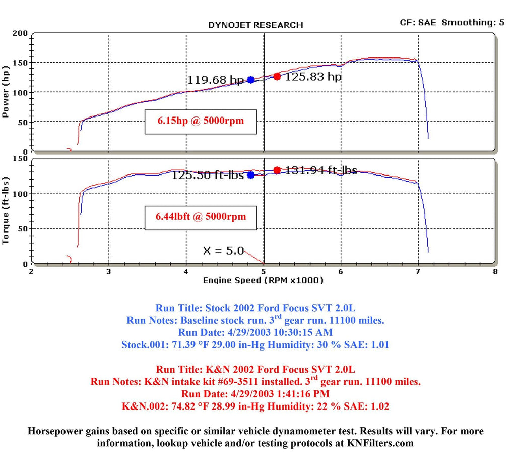 The K&N 69-3511TP Typhoon air intake system is a free-flowing, mandrel-bent aluminum tube air induction system designed to fit some Ford Focus SVT and ST170 models. The restrictive factory air filter and air intake housing are replaced by the K&N Typhoon air intake which is designed to dramatically reduce air flow restriction as it smoothes and straightens air flow. This allows your engine to inhale a larger amount of air than the factory air intake. More air means more usable power and acceleration throughout the engine’s RPM range. The 69-3511TP air intake comes with a black rubber topped K&N high-flow air filter and a heat shield that installs into the previous air box space. Air is directed through the intake tube into the engine’s throttle body for a guaranteed power gain. The intake tube has an attractive chrome-like finish that's made to last and it accommodates the factory mass air sensor and a replacement silicone crank case vent hose. The oversized cone shaped air filter can be used for up to 100,000 miles before servicing is needed depending on driving conditions. This air intake is relatively easy to install usually in 90 minutes or less using existing factory mounting points. The tools needed are a screwdriver, ratchet set and some wrenches. Some Typhoon air intakes are not legal for sale or use in California and other states adopting California emission standards while others are CARB exempt and 50 state legal. Check the K&N catalog or website for vehicle applications and specific CARB status for each vehicle and air intake.