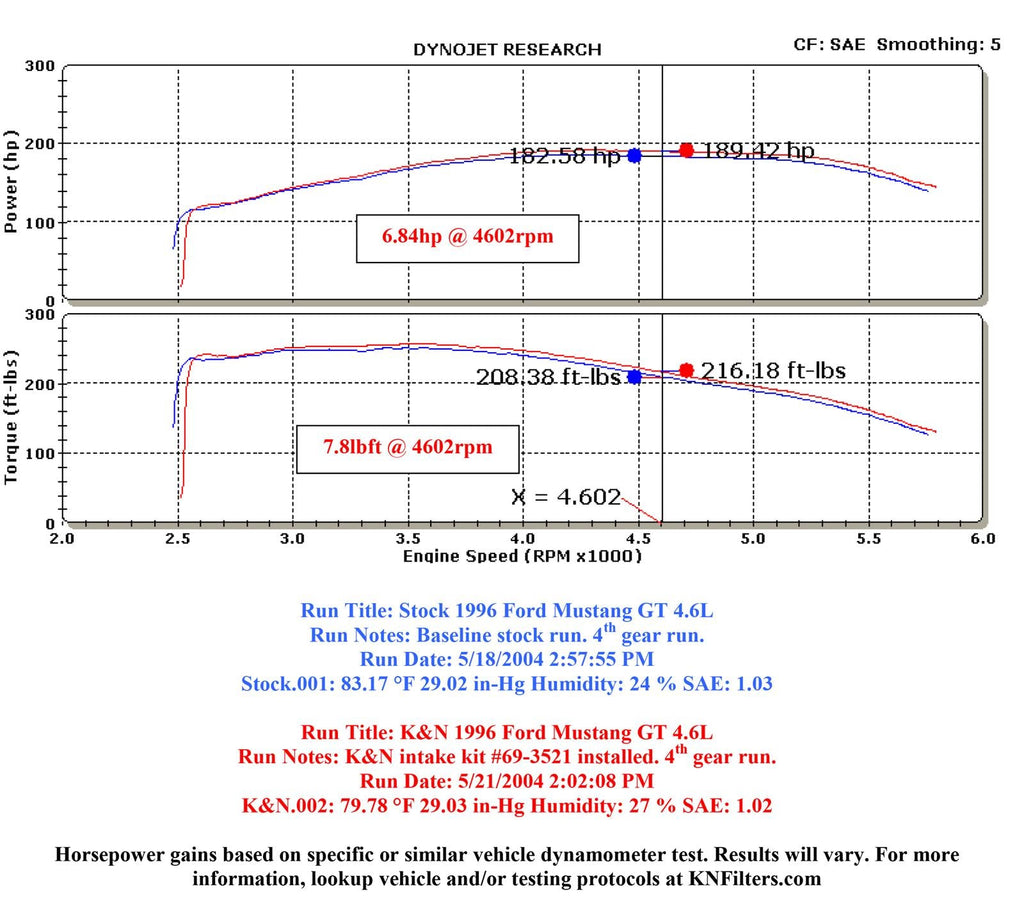 The K&N 69-3521TP Typhoon air intake system is a free-flowing, mandrel-bent aluminum tube air induction system designed to fit some Ford Mustang GT models. The restrictive factory air filter and air intake housing are replaced by the K&N Typhoon air intake which is designed to dramatically reduce air flow restriction as it smoothes and straightens air flow. This allows your engine to inhale a larger amount of air than the factory air intake. More air means more usable power and acceleration throughout the engine’s RPM range. The 69-3521TP air intake comes with a chrome topped K&N high-flow air filter and a heat shield that installs into the previous air box space. Air is directed through the intake tube into the engine’s throttle body for a guaranteed power gain. The intake tube has an attractive chrome-like finish that's made to last and it accommodates the factory mass air sensor as well as the IAC and PCV vent hoses. The oversized cone shaped air filter can be used for up to 100,000 miles before servicing is needed depending on driving conditions. This air intake is relatively easy to install usually in 90 minutes or less using existing factory mounting points. The tools needed are a screwdriver and ratchet set. Some Typhoon air intakes are not legal for sale or use in California and other states adopting California emission standards while others are CARB exempt and 50 state legal. Check the K&N catalog or website for vehicle applications and specific CARB status for each vehicle and air intake.