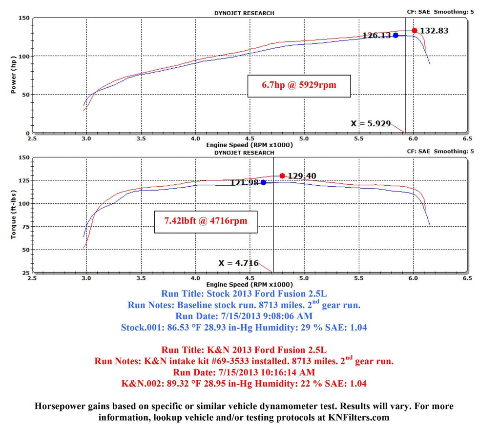 The K&N 69-3533TTK Typhoon air intake system is a free-flowing, mandrel-bent aluminum tube air induction system designed to fit some Ford Fusion models. The restrictive factory air filter and air intake housing are replaced by the K&N Typhoon air intake which is designed to dramatically reduce air flow restriction as it smoothes and straightens air flow. This allows your engine to inhale a larger amount of air than the factory air intake. More air means more usable power and acceleration throughout the engine’s RPM range. The 69-3533TTK air intake comes with a chrome topped K&N high-flow air filter and a heat shield that installs into the previous air box space. Air is directed through the intake tube into the engine’s throttle body for a guaranteed power gain. The intake tube has an attractive textured black powder-coat finish that's made to last and it accommodates the factory mass air sensor, EVAP vent line and a replacement silicone crank case vent hose. The oversized cone shaped air filter can be used for up to 100,000 miles before servicing is needed depending on driving conditions. This air intake is relatively easy to install usually in 90 minutes or less. Some Typhoon air intakes are not legal for sale or use in California and other states adopting California emission standards while others are CARB exempt and 50 state legal. Check the vehicle applications and specific CARB status for each vehicle and air intake.