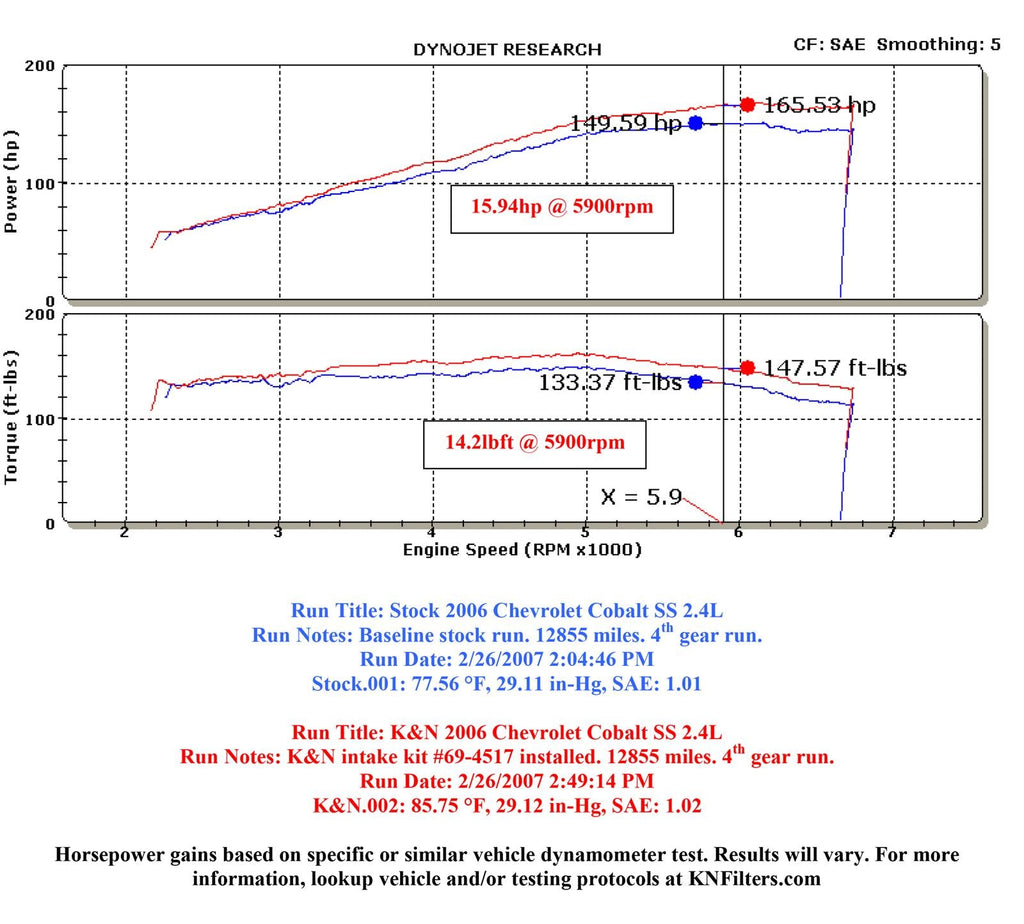 The K&N 69-4517TTK Typhoon air intake system is a free-flowing, mandrel-bent aluminum tube air induction system designed to fit some Chevrolet Cobalt models. The restrictive factory air filter and air intake housing are replaced by the K&N Typhoon air intake which is designed to dramatically reduce air flow restriction as it smoothes and straightens air flow. This allows your engine to inhale a larger amount of air than the factory air intake. More air means more usable power and acceleration throughout the engine’s RPM range. The 69-4517TTK air intake comes with a black rubber topped K&N high-flow air filter and a heat shield that installs into the previous air box space. Air is directed through the intake tube into the engine’s throttle body for a guaranteed power gain. The intake tube has an attractive black powder-coat finish that's made to last and it accommodates the factory mass air sensor and a replacement silicone crank case vent hose. The oversized cone shaped air filter can be used for up to 100,000 miles before servicing is needed depending on driving conditions. This air intake is relatively easy to install usually in 90 minutes or less using existing factory mounting points. The tools needed are a couple of screwdrivers, a ratchet set and some wrenches. Some Typhoon air intakes are not legal for sale or use in California and other states adopting California emission standards while others are CARB exempt and 50 state legal. Check the K&N catalog or website for vehicle applications and specific CARB status for each vehicle and air intake.