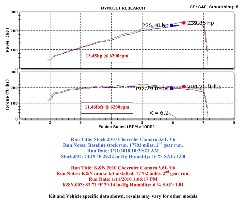 The K&N 69-4520TP Typhoon air intake system is a free-flowing, mandrel-bent aluminum tube air induction system designed to fit some Chevrolet Camaro models. The restrictive factory air filter and air intake housing are replaced by the K&N Typhoon air intake which is designed to dramatically reduce air flow restriction as it smoothes and straightens air flow. This allows your engine to inhale a larger amount of air than the factory air intake. More air means more usable power and acceleration throughout the engine’s RPM range. The 69-4520TP air intake comes with a chrome topped K&N high-flow air filter and a heat shield that installs into the previous air box space. Air is directed through the intake tube into the engine’s throttle body for a guaranteed power gain. The intake tube has an attractive chrome-like finish that's made to last and it accommodates the factory mass air sensor and crank case vent hose. The oversized cone shaped air filter can be used for up to 100,000 miles before servicing is needed depending on driving conditions. This air intake is relatively easy to install usually in 90 minutes or less using existing factory mounting points. The tools needed are a screwdriver, ratchet set and several wrenches. Some Typhoon air intakes are not legal for sale or use in California and other states adopting California emission standards while others are CARB exempt and 50 state legal. Check the K&N catalog or website for vehicle applications and specific CARB status for each vehicle and air intake.