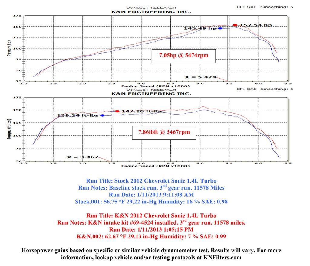 The K&N 69-4524TS Typhoon air intake system is a free-flowing, mandrel-bent aluminum tube air induction system designed to fit some Chevrolet Sonic models. The restrictive factory air filter and air intake housing are replaced by the K&N Typhoon air intake which is designed to dramatically reduce air flow restriction as it smoothes and straightens air flow. This allows your engine to inhale a larger amount of air than the factory air intake. More air means more usable power and acceleration throughout the engine’s RPM range. The 69-4524TS air intake comes with a black rubber topped K&N high-flow air filter and a heat shield that installs into the previous air box space. Air is directed through the intake tube into the engine’s turbo inlet for a guaranteed power gain. The intake tube has an attractive silver powder-coat finish that's made to last and it accommodates the factory mass air sensor. The oversized cone shaped air filter can be used for up to 100,000 miles before servicing is needed depending on driving conditions. This air intake is relatively easy to install usually in 90 minutes or less using existing factory mounting points. The tools needed are a screwdriver, ratchet set and some wrenches. Some Typhoon air intakes are not legal for sale or use in California and other states adopting California emission standards while others are CARB exempt and 50 state legal. Check the K&N catalog or website for vehicle applications and specific CARB status for each vehicle and air intake.