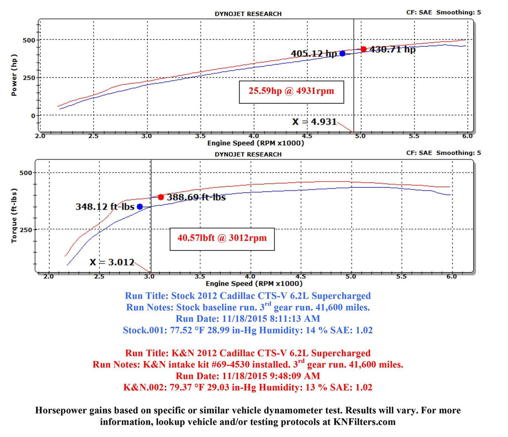 The K&N 69-4530TS Typhoon air intake system is a free-flowing, mandrel-bent aluminum tube air induction system designed to fit specific Cadillac CTS-V models. The restrictive factory air filter and air intake housing are replaced by the K&N Typhoon air intake which is designed to dramatically reduce air flow restriction as it smoothes and straightens air flow. This allows your engine to inhale a larger amount of air than the factory air intake. More air means more usable power and acceleration throughout the engine’s RPM range. In addition to more power, this air intake system improves engine sound with more aggressive and deeper acoustics during acceleration. Included is a chrome topped K&N high-flow air filter and a heat shield that installs into the original air box space. Air is directed through the intake tube into the engine’s throttle body for a guaranteed power gain. The intake tube has an attractive silver powder-coated finish that's made to last and it accommodates the factory mass air sensor and crank case vent line. The oversized cone shaped air filter can be used for up to 100,000 miles before servicing is needed depending on driving conditions. This air intake is relatively easy to install usually in 90 minutes or less using existing factory mounting points. The tools needed are a screwdriver, pliers, a ratchet set and several wrenches.
