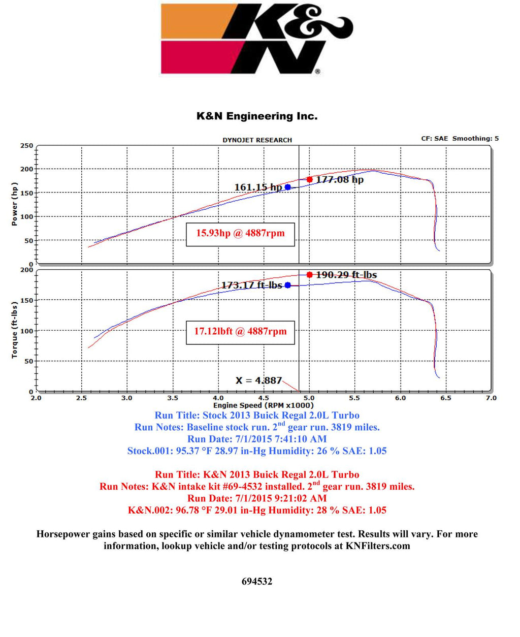 The K&N 69-4532TTK Typhoon air intake system is a free-flowing, mandrel-bent aluminum tube air induction system designed to fit specific Buick Regal models. The restrictive factory air filter and air intake housing are replaced by the K&N Typhoon air intake which is designed to dramatically reduce air flow restriction as it smoothes and straightens air flow. This allows your engine to inhale a larger amount of air than the factory air intake. More air means more usable power and acceleration throughout the engine’s RPM range. In addition to more power, this air intake system improves engine sound with more aggressive and deeper acoustics during acceleration. Included is a black rubber topped K&N high-flow air filter and a heat shield that installs into the original air box space. Air is directed through the intake tube into the engine’s throttle body for a guaranteed power gain. The intake tube has an attractive black powder-coated finish that's made to last and it accommodates the factory mass air sensor and crank case vent hose. The oversized cone shaped air filter can be used for up to 100,000 miles before servicing is needed depending on driving conditions. This air intake is relatively easy to install usually in 90 minutes or less using existing factory mounting points. The tools needed are a screwdriver, pliers, ratchet set and several wrenches.