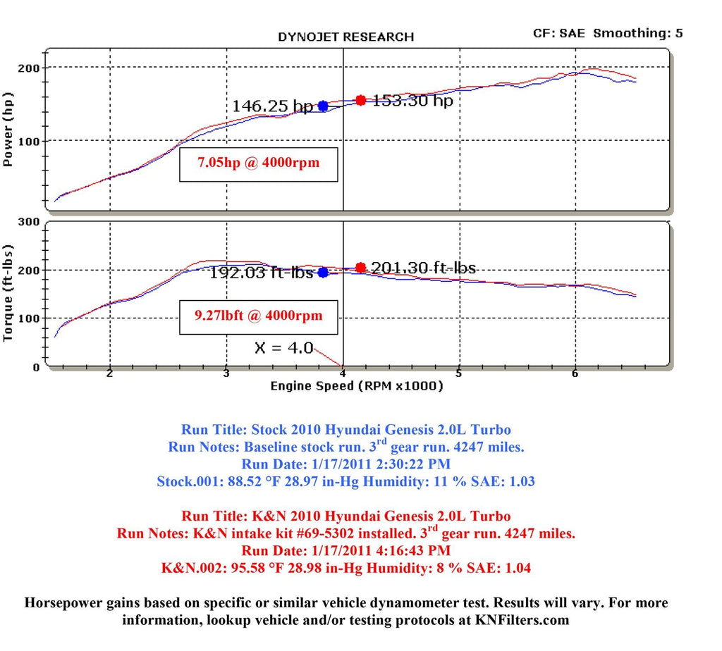 The K&N 69-5302TTK Typhoon air intake system is a free-flowing, mandrel-bent aluminum tube air induction system designed to fit some Hyundai Genesis Turbo Coupe models. The restrictive factory air filter and air intake housing are replaced by the K&N Typhoon air intake which is designed to dramatically reduce air flow restriction as it smoothes and straightens air flow. This allows your engine to inhale a larger amount of air than the factory air intake. More air means more usable power and acceleration throughout the engine’s RPM range. The 69-5302TTK air intake comes with an ultra-lightweight carbon fiber topped K&N high-flow air filter and a heat shield that installs into the previous air box space. Air is directed through the intake tube into the engine’s turbo inlet for a guaranteed power gain. The intake tube has an attractive textured black finish that's made to last and accommodates the factory EVAP vent line and crank case vent hose. The oversized cone shaped air filter can be used for up to 100,000 miles before servicing is needed depending on driving conditions. This air intake is relatively easy to install usually in 90 minutes or less using existing factory mounting points. The tools needed are a screwdriver, ratchet set, pliers and some wrenches. Some Typhoon air intakes are not legal for sale or use in California and other states adopting California emission standards while others are CARB exempt and 50 state legal. Check the K&N catalog or website for vehicle applications and specific CARB status for each vehicle and air intake.