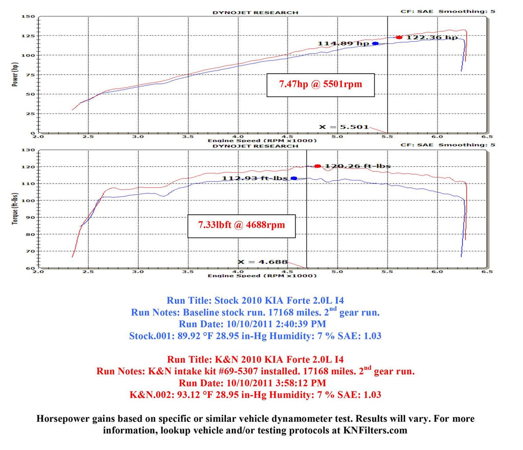 The K&N 69-5307TTK Typhoon air intake system is a free-flowing, mandrel-bent aluminum tube air induction system designed to fit some KIA Forte and Forte Koup models. The restrictive factory air filter and air intake housing are replaced by the K&N Typhoon air intake which is designed to dramatically reduce air flow restriction as it smoothes and straightens air flow. This allows your engine to inhale a larger amount of air than the factory air intake. More air means more usable power and acceleration throughout the engine’s RPM range. The 69-5307TTK air intake comes with a black rubber topped K&N high-flow air filter and a heat shield that installs into the previous air box space. Air is directed through the intake tube into the engine’s throttle body for a guaranteed power gain. The intake tube has an attractive textured black finish that's made to last and it accommodates the factory crank case vent hose and EVAP vent hose (on certain vehicles). The oversized cone shaped air filter can be used for up to 100,000 miles before servicing is needed depending on driving conditions. This air intake is relatively easy to install usually in 90 minutes or less using existing factory mounting points. The tools needed are a screwdriver, pliers, ratchet set and some wrenches. Some Typhoon air intakes are not legal for sale or use in California and other states adopting California emission standards while others are CARB exempt and 50 state legal. Check the K&N catalog or website for vehicle applications and specific CARB status for each vehicle and air intake.