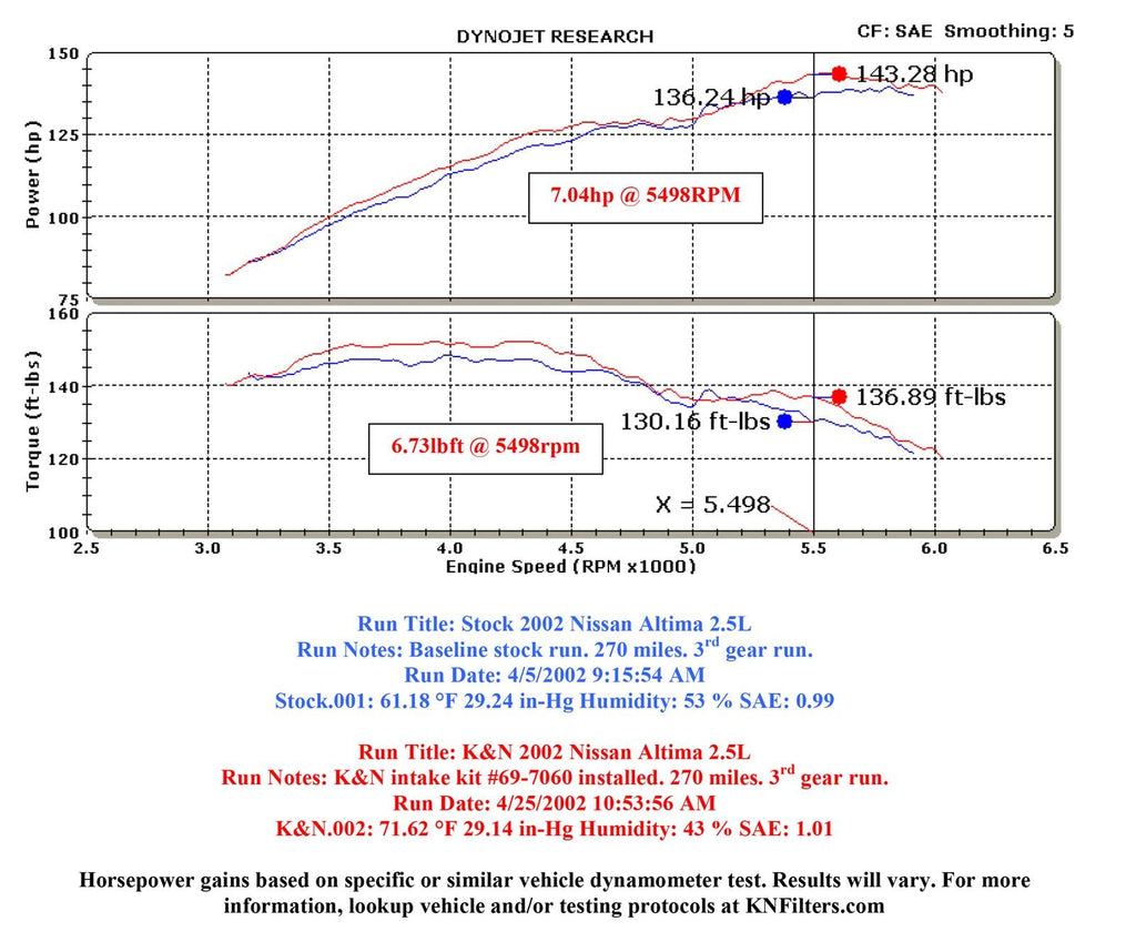 The K&N 69-7060TS Typhoon cold-air intake system is a free-flowing, mandrel-bent aluminum tube air induction system designed to fit some Nissan Altima models. The restrictive factory air filter and air intake housing are replaced by the K&N Typhoon cold-air intake which is designed to pull in relatively cooler air and dramatically reduce air flow restriction by smoothing and straightening air flow. This allows your engine to inhale a larger amount of denser air than the factory air intake. More air means more usable power and acceleration throughout the engine’s RPM range. The cold-air intake system accommodates the factory mass air sensor and transmission vent hose. The oversized cone shaped air filter comes with a water repellent DryCharger filter wrap to protect the filter from moisture. The air filter can be used for up to 100,000 miles before servicing is needed depending on driving conditions. This cold air intake is relatively easy to install usually in 90 minutes or less using existing factory mounting points. The tools needed are a screwdriver, a ratchet set and two Allen wrenches. Some Typhoon air intakes are not legal for sale or use in California and other states adopting California emission standards while others are CARB exempt and 50 state legal. Check the K&N catalog or website for vehicle applications and specific CARB status for each vehicle and air intake.