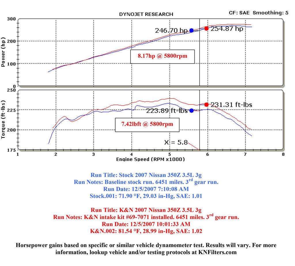 The K&N 69-7071TS Typhoon air intake system is a free-flowing, mandrel-bent aluminum tube air induction system designed to fit some Nissan 350Z models. The restrictive factory air filter and air intake housing are replaced by the K&N Typhoon air intake which is designed to dramatically reduce air flow restriction as it smoothes and straightens air flow. This allows your engine to inhale a larger amount of air than the factory air intake. More air means more usable power and acceleration throughout the engine’s RPM range. The 69-7071TS air intake comes with dual black rubber topped K&N high-flow air filters and heat shields that installs into the previous air box spaces. Air is directed through the intake tubes into the engine’s throttle body for a guaranteed power gain. The intake tubes have an attractive silver powder-coat finish that's made to last and it accommodates the factory mass air sensor and crank case vent chamber. The oversized cone shaped air filters can be used for up to 100,000 miles before servicing is needed depending on driving conditions. This air intake is relatively easy to install usually in 90 minutes or less using existing factory mounting points. The tools needed are a couple of screwdrivers, pliers, a ratchet set and some wrenches. Some Typhoon air intakes are not legal for sale or use in California and other states adopting California emission standards while others are CARB exempt and 50 state legal. Check the K&N catalog or website for vehicle applications and specific CARB status for each vehicle and air intake.