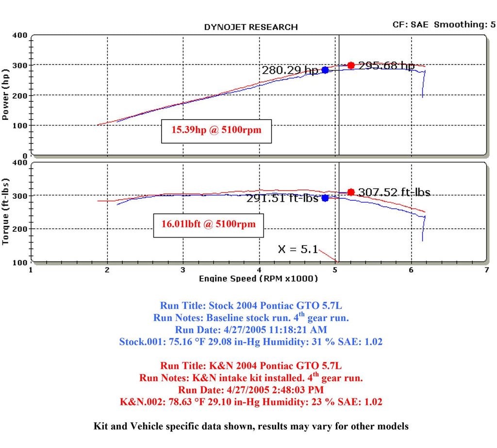 The K&N 69-7200TP Typhoon air intake system is a free-flowing, mandrel-bent aluminum tube air induction system designed to fit some Pontiac GTO models. The restrictive factory air filter and air intake housing are replaced by the K&N Typhoon air intake which is designed to dramatically reduce air flow restriction as it smoothes and straightens air flow. This allows your engine to inhale a larger amount of air than the factory air intake. More air means more usable power and acceleration throughout the engine’s RPM range. The 69-7200TP air intake comes with a chrome topped K&N high-flow air filter and a heat shield that installs into the previous air box space. Air is directed through the intake tube into the engine’s throttle body for a guaranteed power gain. The intake tube has an attractive chrome-like finish that's made to last and it accommodates the factory mass air sensor and air temperature sensor. The oversized cone shaped air filter can be used for up to 100,000 miles before servicing is needed depending on driving conditions. This air intake is relatively easy to install usually in 90 minutes or less using existing factory mounting points. The tools needed are a screwdriver, pliers, ratchet set and some wrenches. Some Typhoon air intakes are not legal for sale or use in California and other states adopting California emission standards while others are CARB exempt and 50 state legal. Check the K&N catalog or website for vehicle applications and specific CARB status for each vehicle and air intake.
