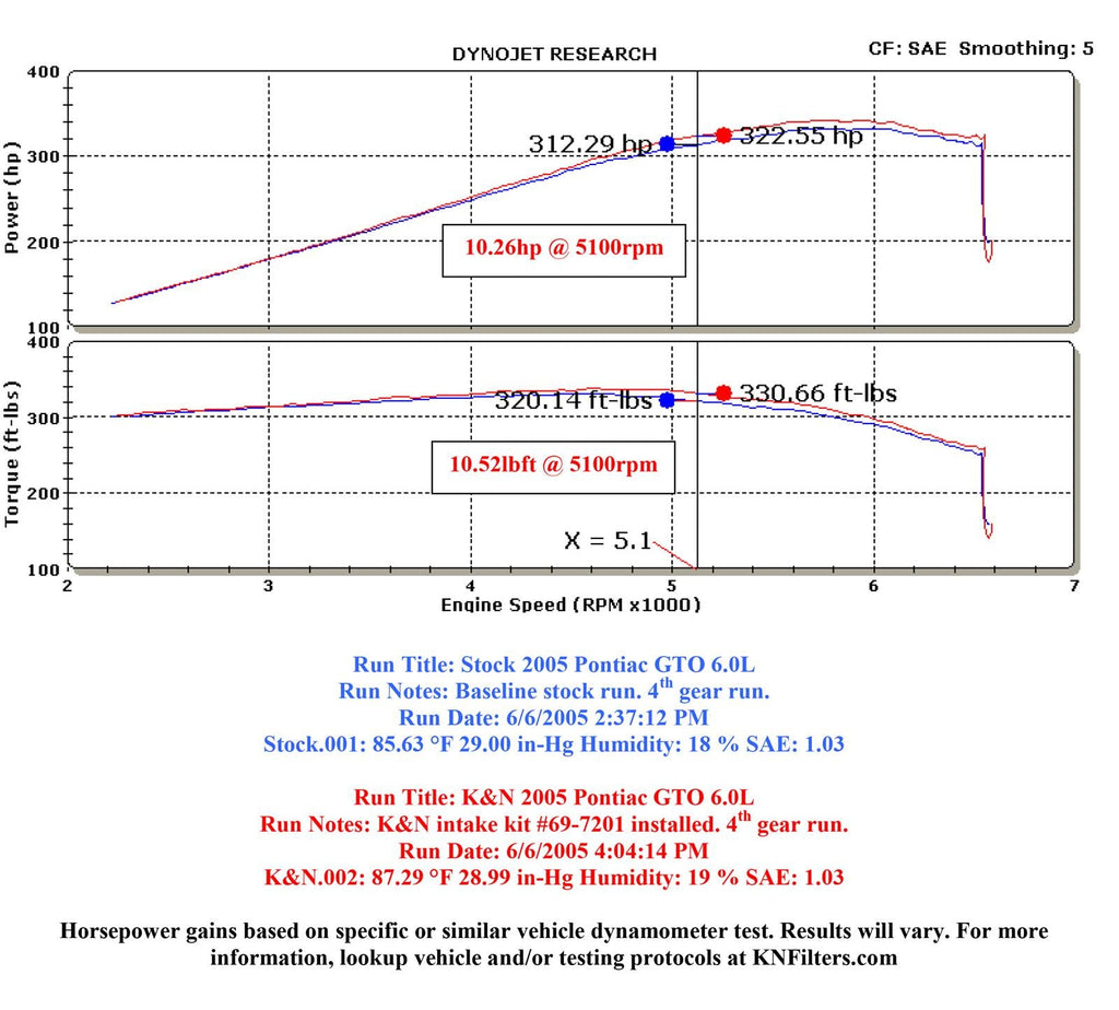 The K&N 69-7201TP Typhoon air intake system is a free-flowing, mandrel-bent aluminum tube air induction system designed to fit some Pontiac GTO models. The restrictive factory air filter and air intake housing are replaced by the K&N Typhoon air intake which is designed to dramatically reduce air flow restriction as it smoothes and straightens air flow. This allows your engine to inhale a larger amount of air than the factory air intake. More air means more usable power and acceleration throughout the engine’s RPM range. The 69-7201TP air intake comes with a chrome topped K&N high-flow air filter and a heat shield that installs into the previous air box space. Air is directed through the intake tube into the engine’s throttle body for a guaranteed power gain. The intake tube has an attractive chrome-like finish that's made to last and it accommodates the factory mass air sensor and crank case vent hose. The oversized cone shaped air filter can be used for up to 100,000 miles before servicing is needed depending on driving conditions. This air intake is relatively easy to install usually in 90 minutes or less using existing factory mounting points. The tools needed are a screwdriver, ratchet set and some wrenches. Some Typhoon air intakes are not legal for sale or use in California and other states adopting California emission standards while others are CARB exempt and 50 state legal. Check the K&N catalog or website for vehicle applications and specific CARB status for each vehicle and air intake.