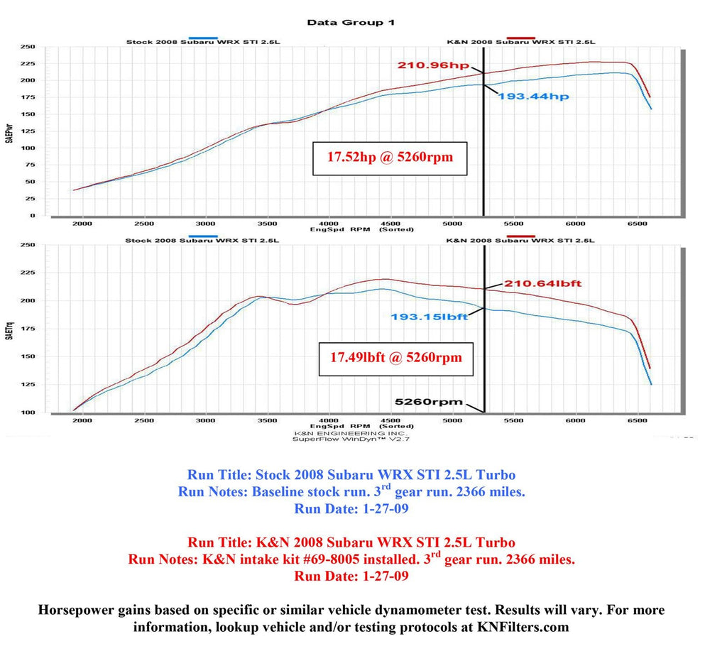 The K&N 69-8005TWR Typhoon air intake system is a free-flowing, mandrel-bent aluminum tube air induction system designed to fit some Subaru Impreza WRX STI and WRX STI models. The restrictive factory air filter and air intake housing are replaced by the K&N Typhoon air intake which is designed to dramatically reduce air flow restriction as it smoothes and straightens air flow. This allows your engine to inhale a larger amount of air than the factory air intake. More air means more usable power and acceleration throughout the engine’s RPM range. The 69-8005TWR air intake comes with an ultra-lightweight carbon fiber topped K&N high-flow air filter and a heat shield that installs into the previous air box space. Air is directed through the intake tube into the engine’s throttle body for a guaranteed power gain. The intake tube has an attractive red powder-coat finish that's made to last and it accommodates the factory mass air sensor. The oversized cone shaped air filter can be used for up to 100,000 miles before servicing is needed depending on driving conditions. This air intake is relatively easy to install usually in 90 minutes or less using existing factory mounting points. The tools needed are a couple of screwdrivers, ratchet set and some wrenches. Some Typhoon air intakes are not legal for sale or use in California and other states adopting California emission standards while others are CARB exempt and 50 state legal. Check the K&N catalog or website for vehicle applications and specific CARB status for each vehicle and air intake.
