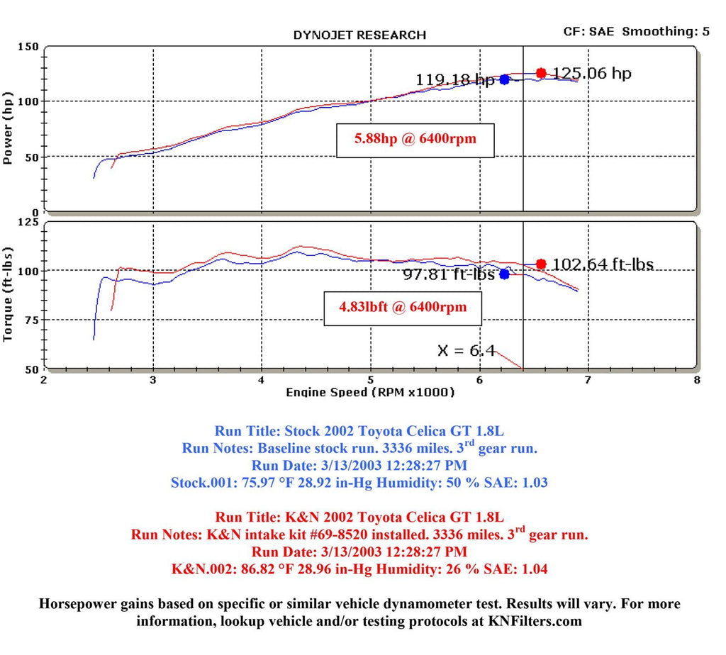 The K&N 69-8520TS Typhoon air intake system is a free-flowing, mandrel-bent aluminum tube air induction system designed to fit some Toyota Celica GT models. The restrictive factory air filter and air intake housing are replaced by the K&N Typhoon air intake which is designed to dramatically reduce air flow restriction as it smoothes and straightens air flow. This allows your engine to inhale a larger amount of air than the factory air intake. More air means more usable power and acceleration throughout the engine’s RPM range. The 69-8520TS air intake comes with a black rubber topped K&N high-flow air filter that installs into the previous air box space. Air is directed through the intake tube into the engine’s throttle body for a guaranteed power gain. The intake tube has an attractive silver powder-coat finish that's made to last and it accommodates the factory mass air sensor, EVAP OBD canister closed valve and PWM vacuum switching valve. The oversized cone shaped air filter can be used for up to 100,000 miles before servicing is needed depending on driving conditions. This air intake is relatively easy to install usually in 90 minutes or less. Some Typhoon air intakes are not legal for sale or use in California and other states adopting California emission standards while others are CARB exempt and 50 state legal. Check the K&N catalog or website for vehicle applications and specific CARB status for each vehicle and air intake.